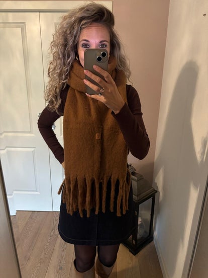 Deze mooie zandkleurige omslag doek is heerlijk te dragen over bijvoorbeeld een spijkerjasje of leren jack