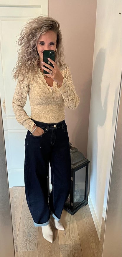 Deze trend gaan we veel zien dit najaar! De balloon jeans/barrel fit. Super gaaf model met een top pasvorm en hele toffe donkere jeans wassing. Ons model heeft de jeans zelf een keer omgeslagen, dit hoeft niet. De jeans van Queen Hearts valt goed op maat. Ons model draagt haar eigen maat, maat S