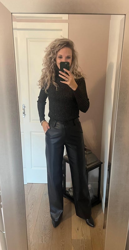 MUSTHAVE! Deze imitatieleren broek mag absoluut niet ontbreken in jouw wardrobe! Het heeft een super zachte stof, is van vegan leer, heeft een hoge taille met elastiek en steekzakken. Onder aan de pijpen heeft de broek een kleine split.
