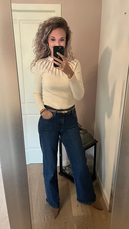 Deze fijne wide leg heeft veel stretch waardoor de jeans heerlijk draagt. Ons model draagt haar eigen maat, S/36