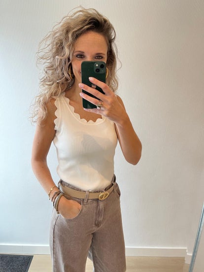 Deze top met kartel randje langs de armen en onderaan de top is voor nu leuk te dragen met een vestje. De top gaat in maten en ons model draagt haar eigen maat