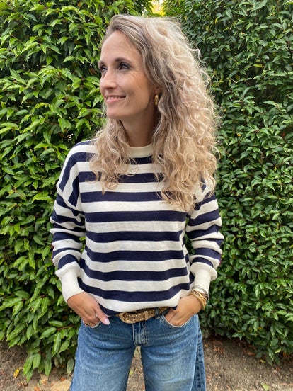 Deze fijne trui met bruine streep gaat in maten en valt op maat
