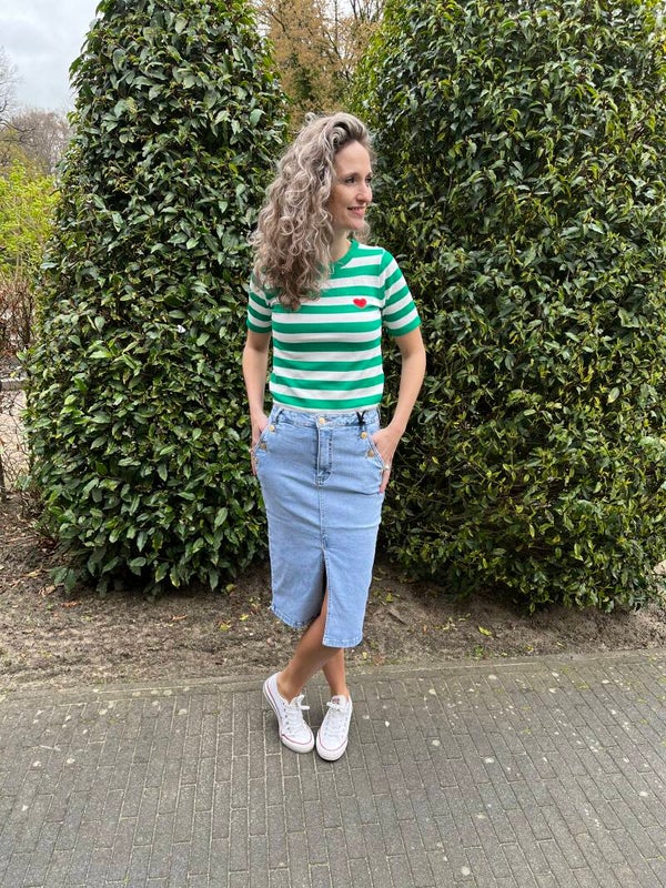 Super gave jeans rok met split aan de voorzijde. De gouden knopen maken het af.
