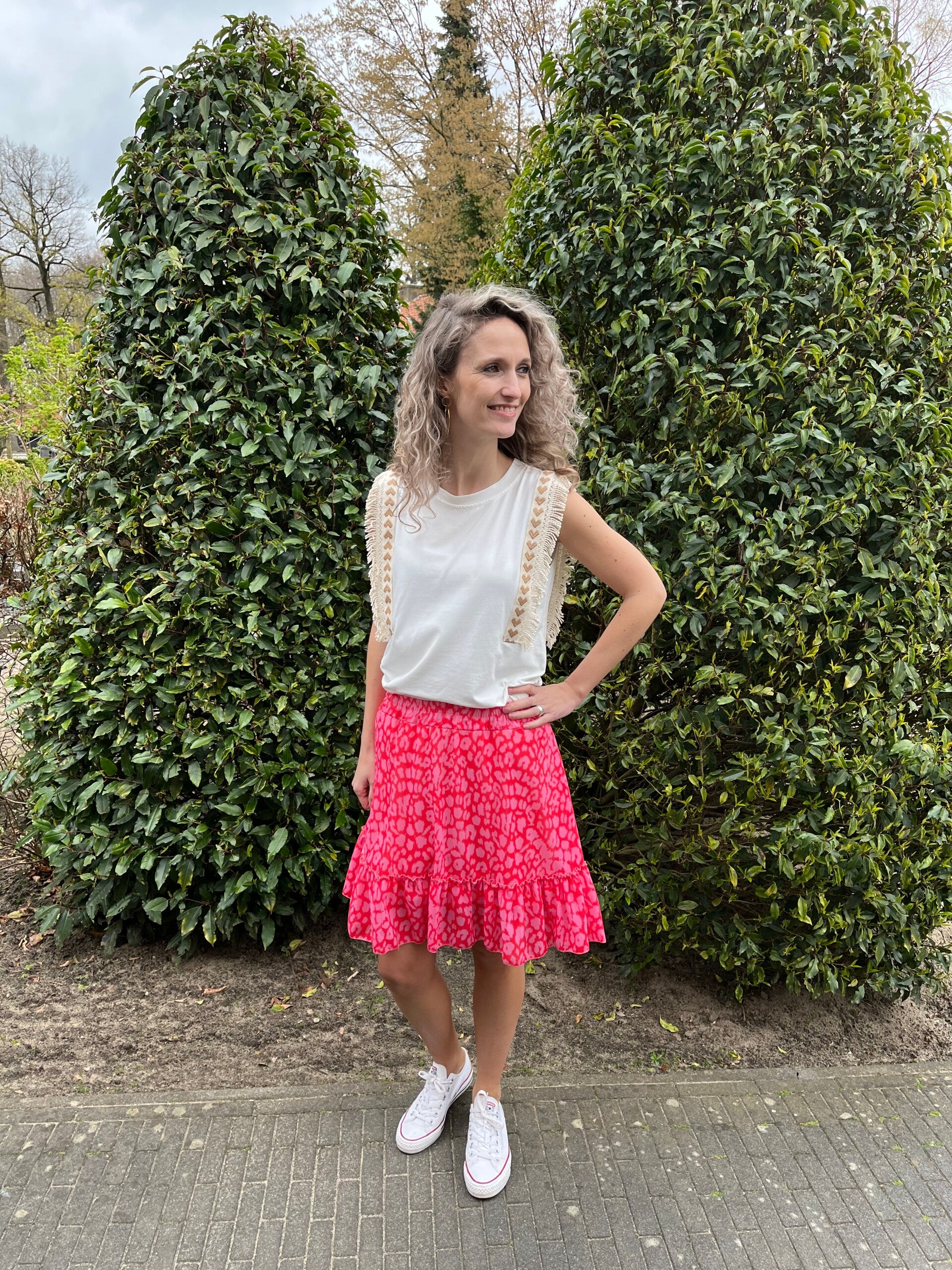 Dit leuke panter print rokje in roze/rood is one size en te dragen t/m maat 40. Er zit een onder rokje bij onder