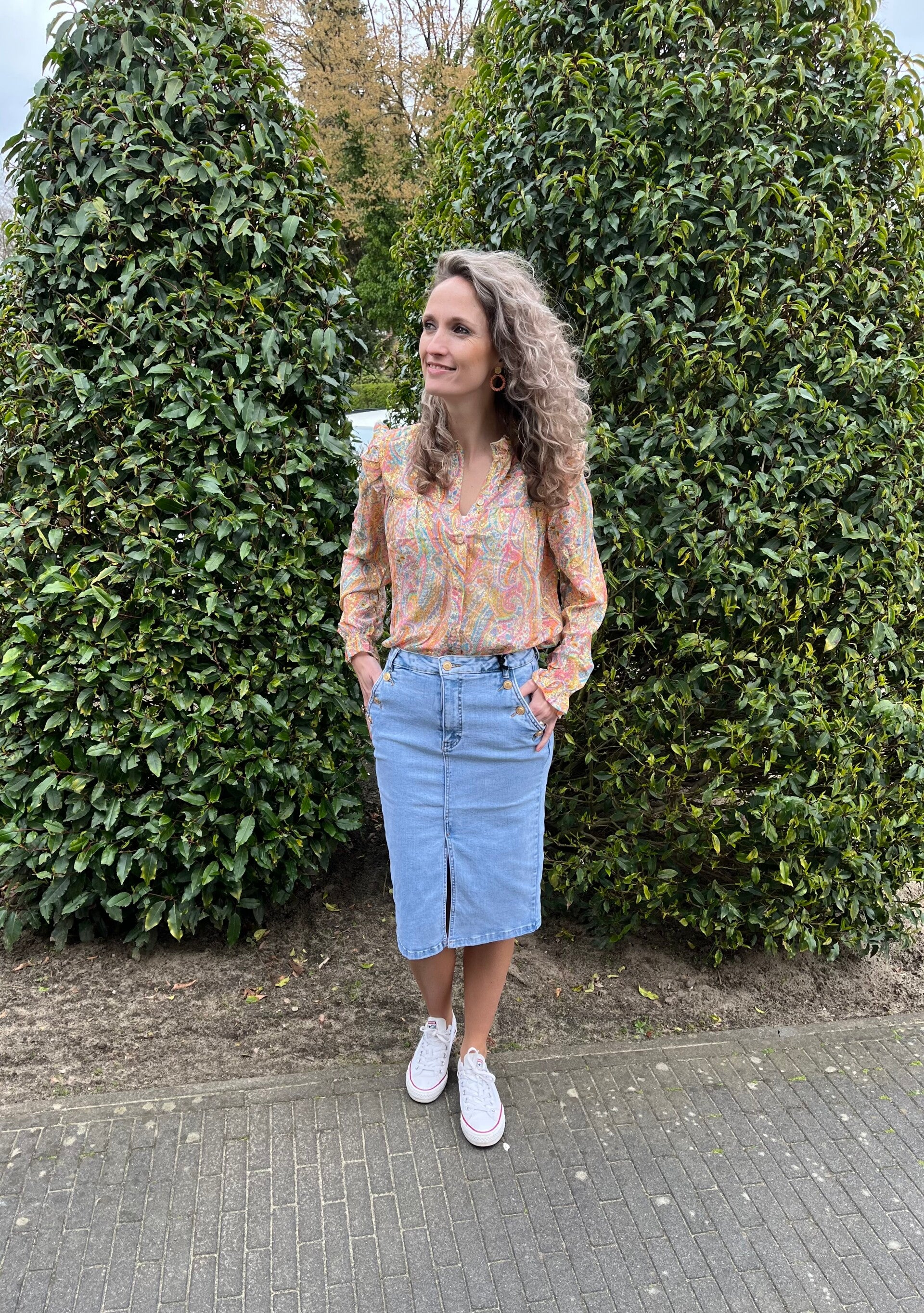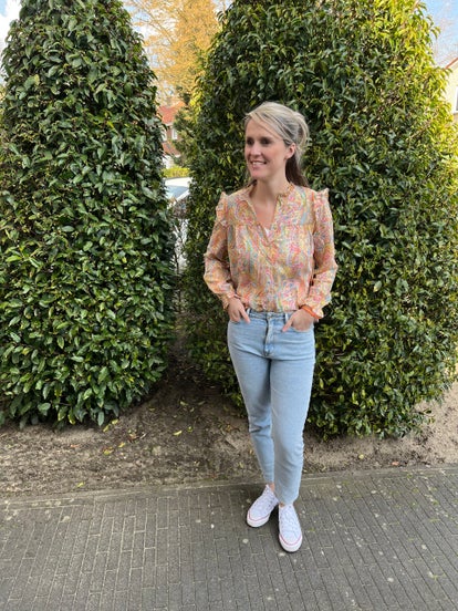 Gezellig fleurig blousje. Iets een roesel aan de bovenzijde en de mouwen zijn door de elastieken makkelijk op te halen. De blouse heeft subtiel gouden details.