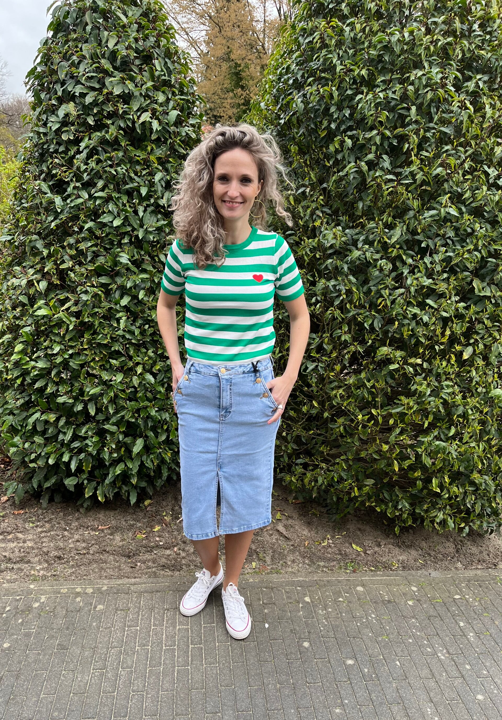 Deze mooie kleur groen is gecombineerd met wit. Heerlijk t-shirt en makkelijk te combineren.
