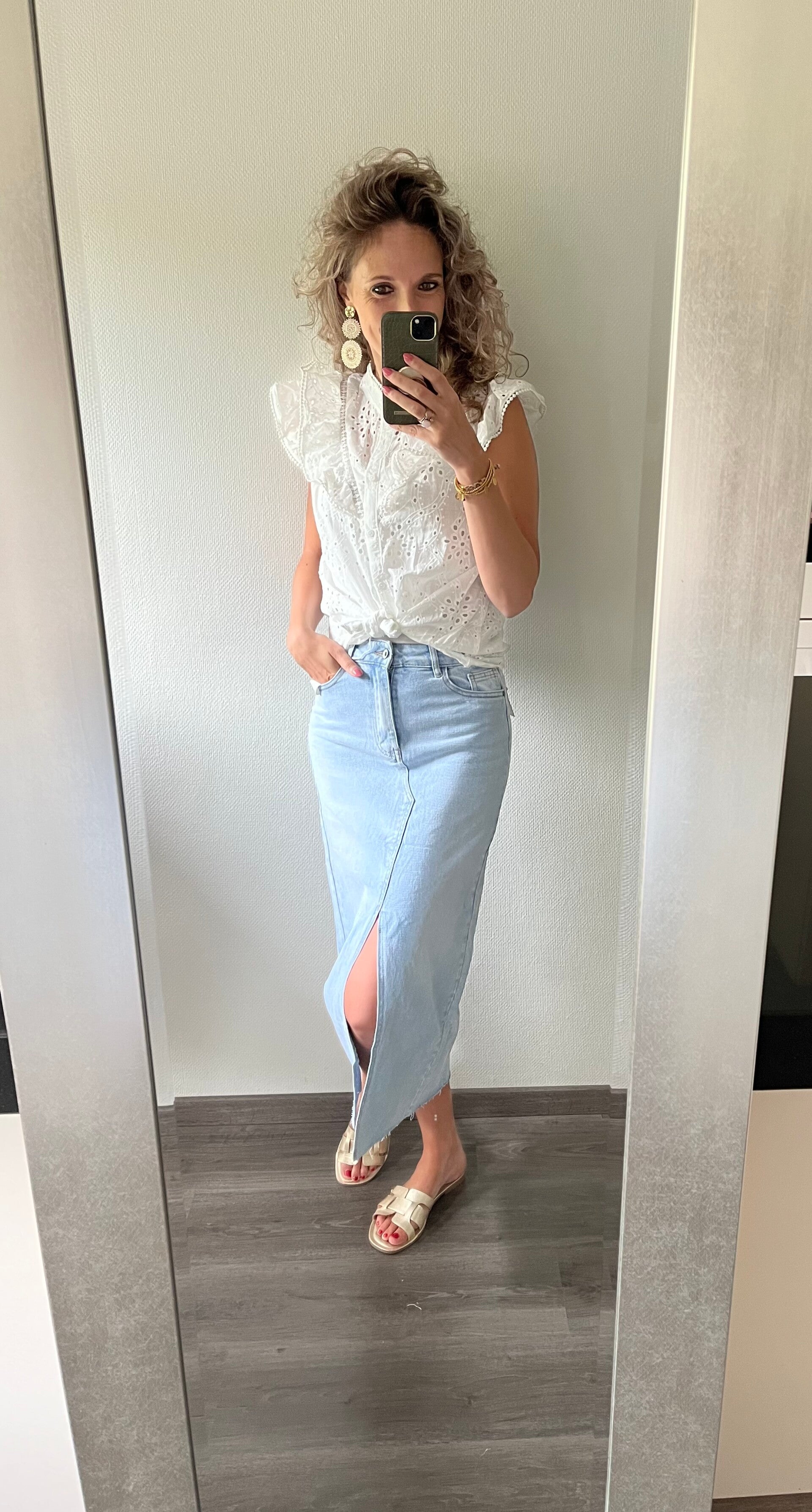 De musthave voor deze zomer. De lange jeans rok, deze mag niet ontbreken uit jouw garderobe! Of je het nu stoer draagt met een paar sneakers of netjes met hoge hakken, het kan allemaal! Deze rok bevat stretch en valt op maat.