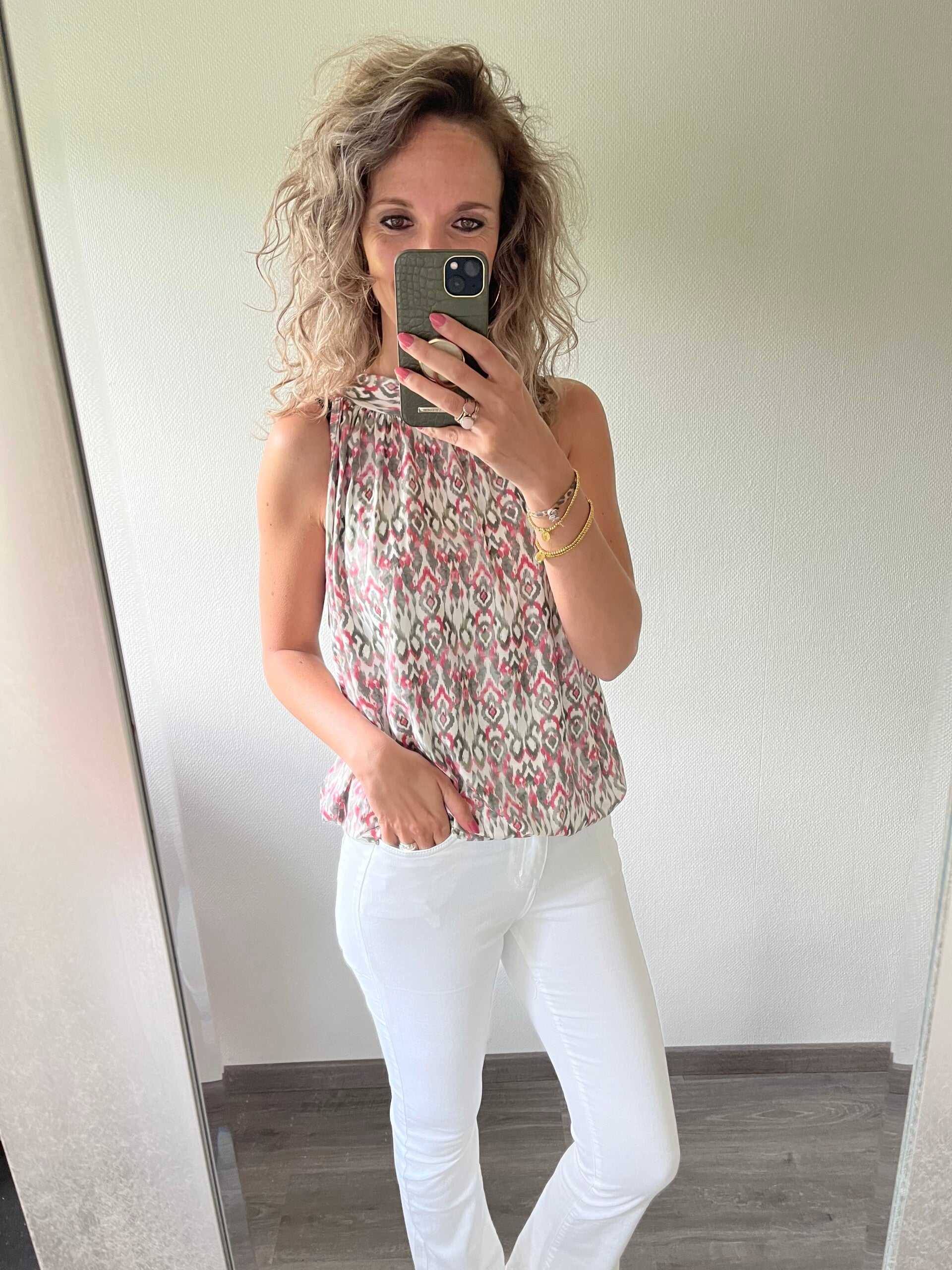 Het heeft een leuke kleur samenstelling van groen en roze. De onderzijde heeft elastiek waardoor je het mooi kan blousen.