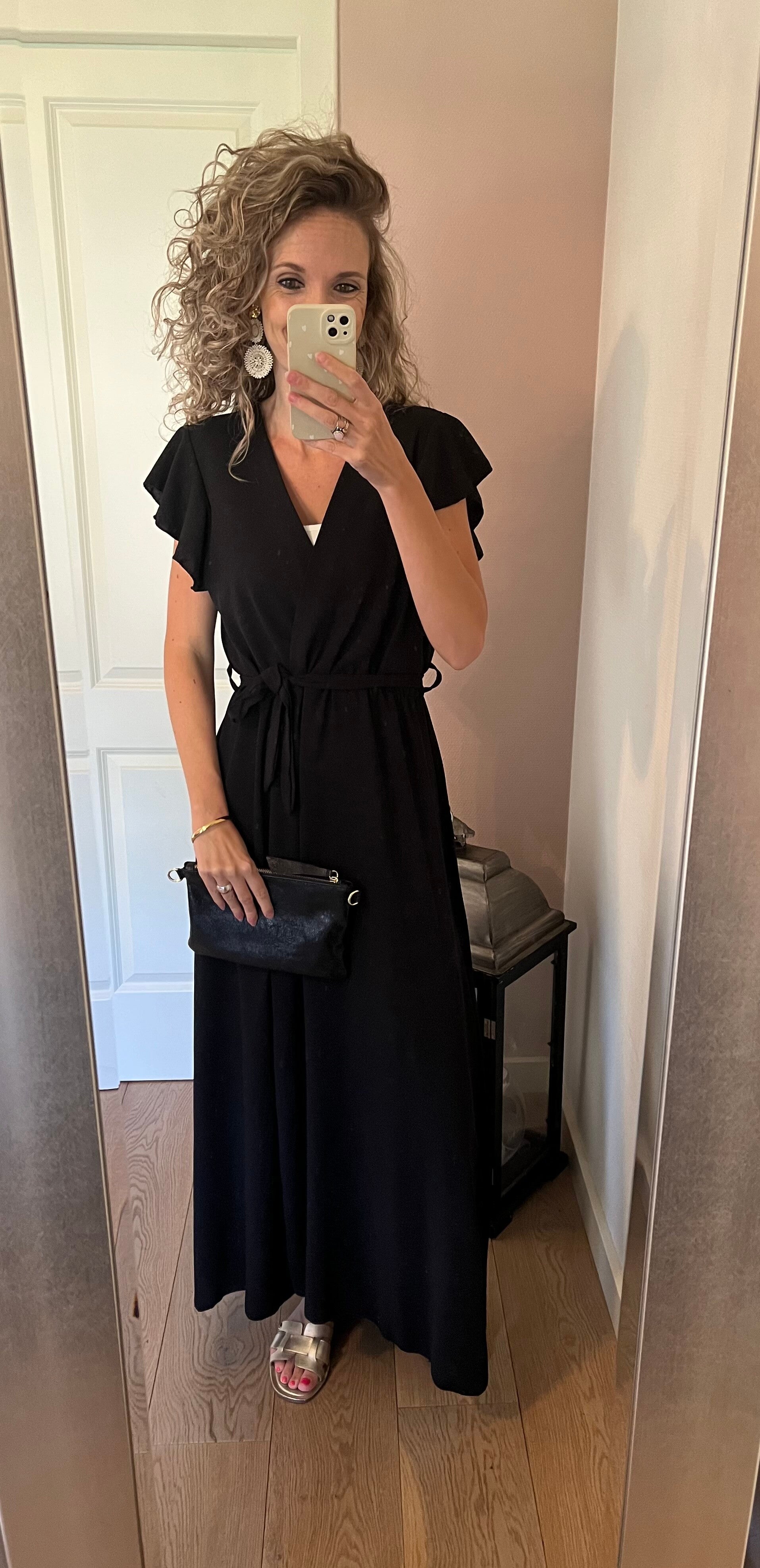 Deze mooie lang jurk heeft een overslag welke vast zit. Iets een mouwtje en een koordje om de jurk mee te strikken. Deze kan je eraf laten doordat de jurk elastiek in de taille heeft. De jurk is one size