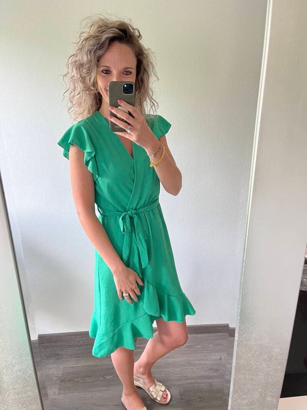Wat een mooie kleur groen! Dit heerlijke jurkje heeft een overslag welke vast zit. Daardoor makkelijk in dragen! De jurk gaat in maten S/M L/XL. Elastiek in de taille en een koord, welke eventueel te verwijderen is.