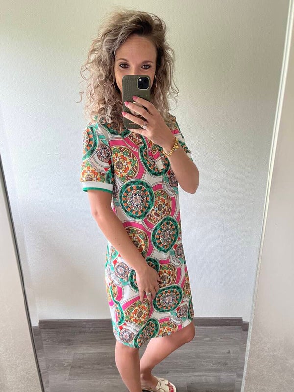 Een mooie kleurrijke jurk! Draagt heerlijk en een mooi recht model. De jurk gaat in maten. De maat S/M is zowel voor de maat S als M goed. De jurk valt net boven de knie.