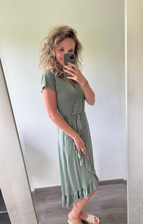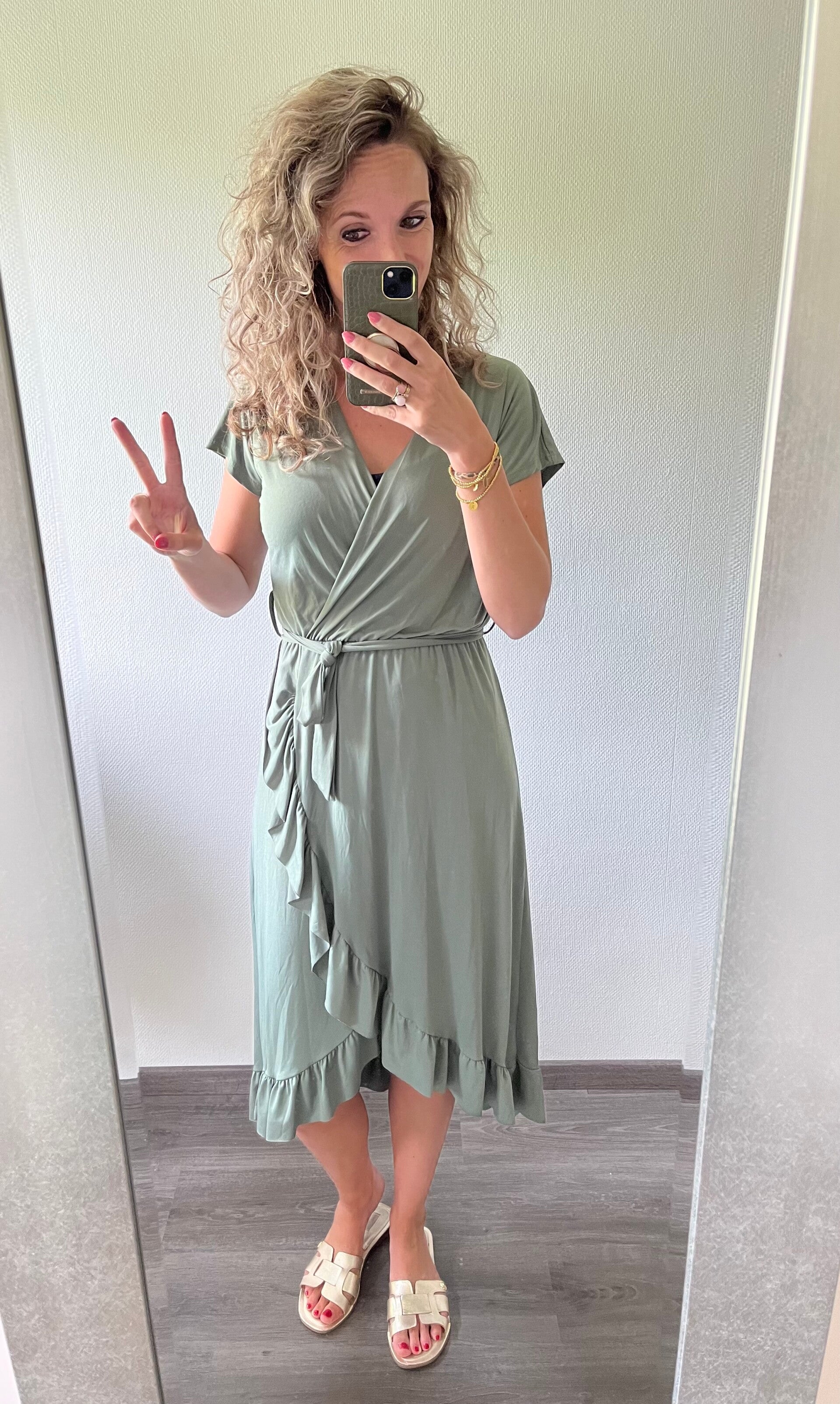 Deze overslag jurk heeft een klein mouwtje. De overslag zit vast wat het dragen erg fijn maakt. In de taille zit elastiek, er zit een losse koord bij welke je in de taille kan strikken. Heerlijk luchtig jurkje!