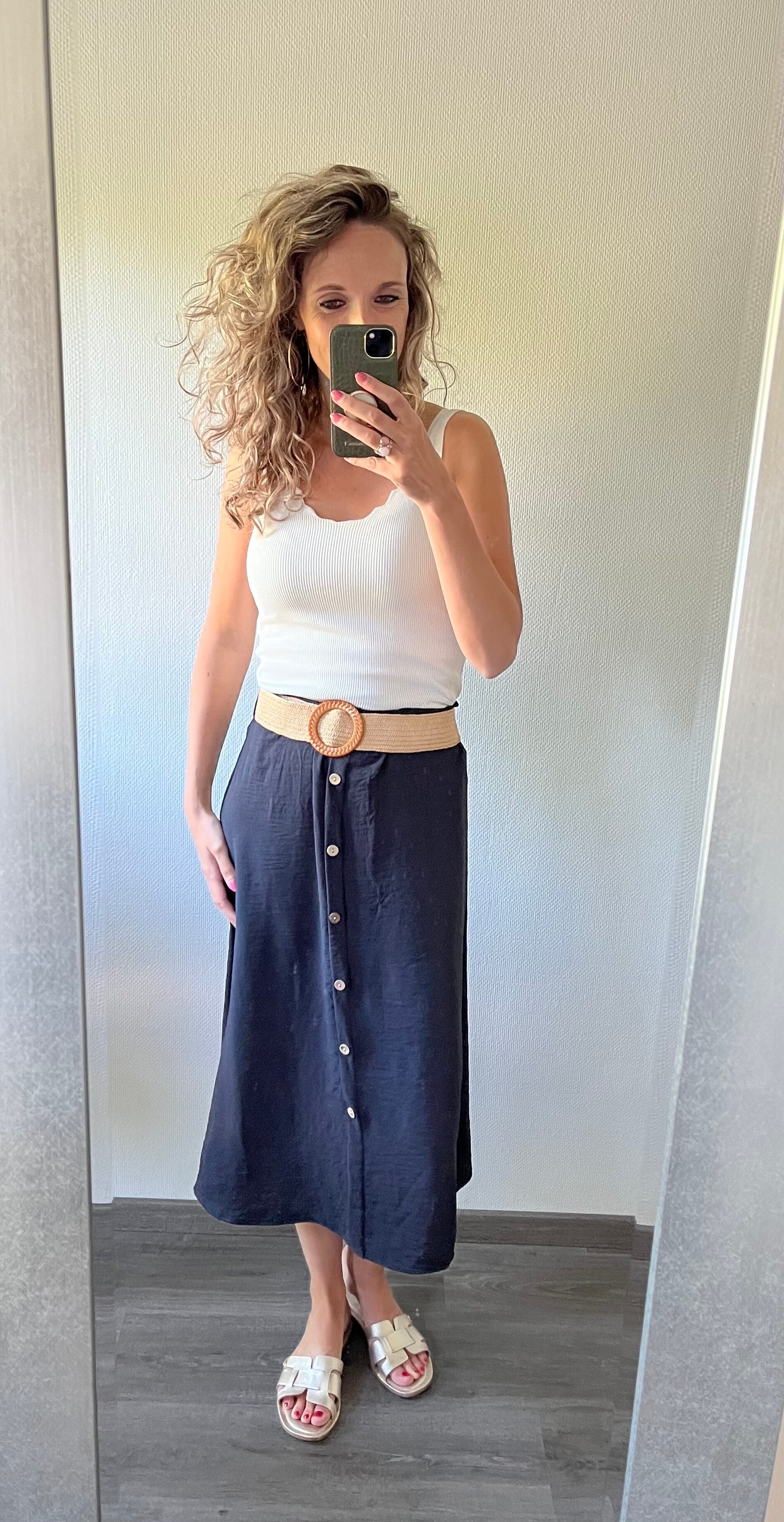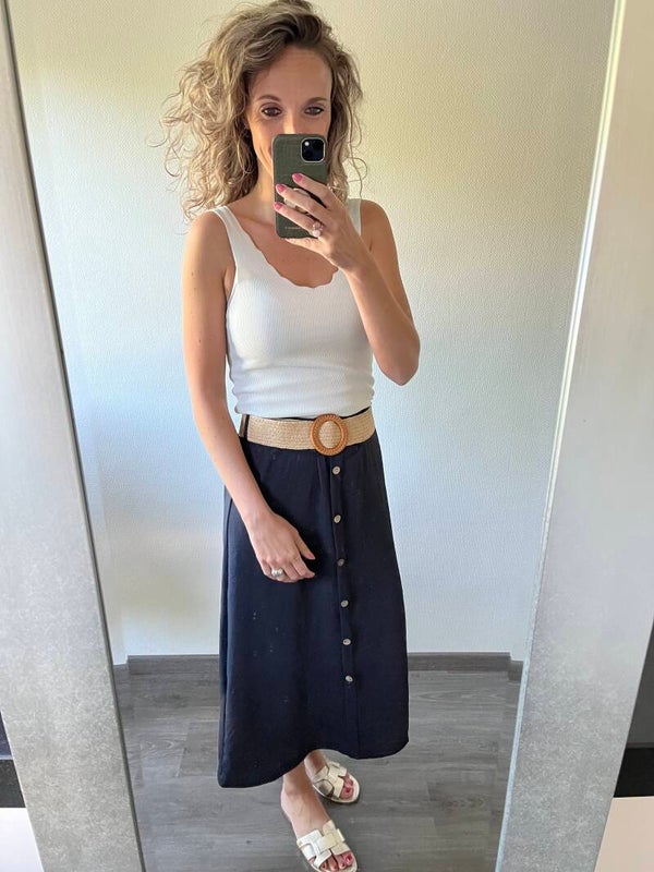 Deze rok wordt met stretch riem geleverd. De voorkant van de rok zit dicht gestikt waardoor de rok niet open kan vallen. Het heeft een super leuke lengte en goed af te stylen met slippers of sneakers.