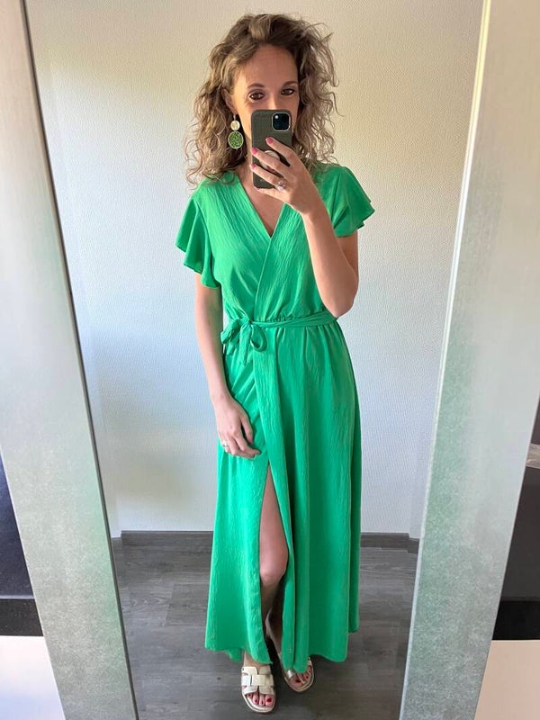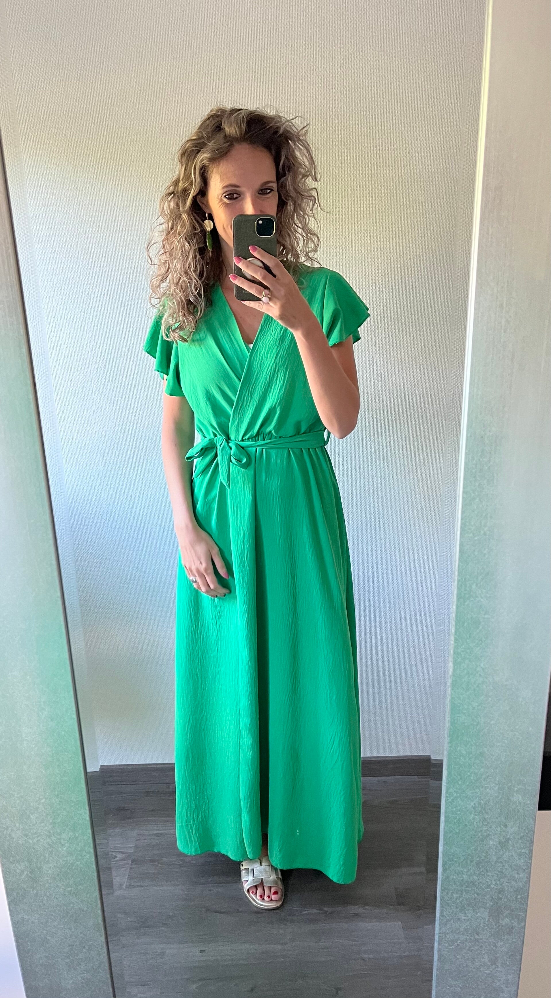Deze mooie lang jurk heeft een overslag welke vast zit. Iets een mouwtje en een koordje om de jurk mee te strikken. Deze kan je eraf laten doordat de jurk elastiek in de taille heeft. De jurk is one size