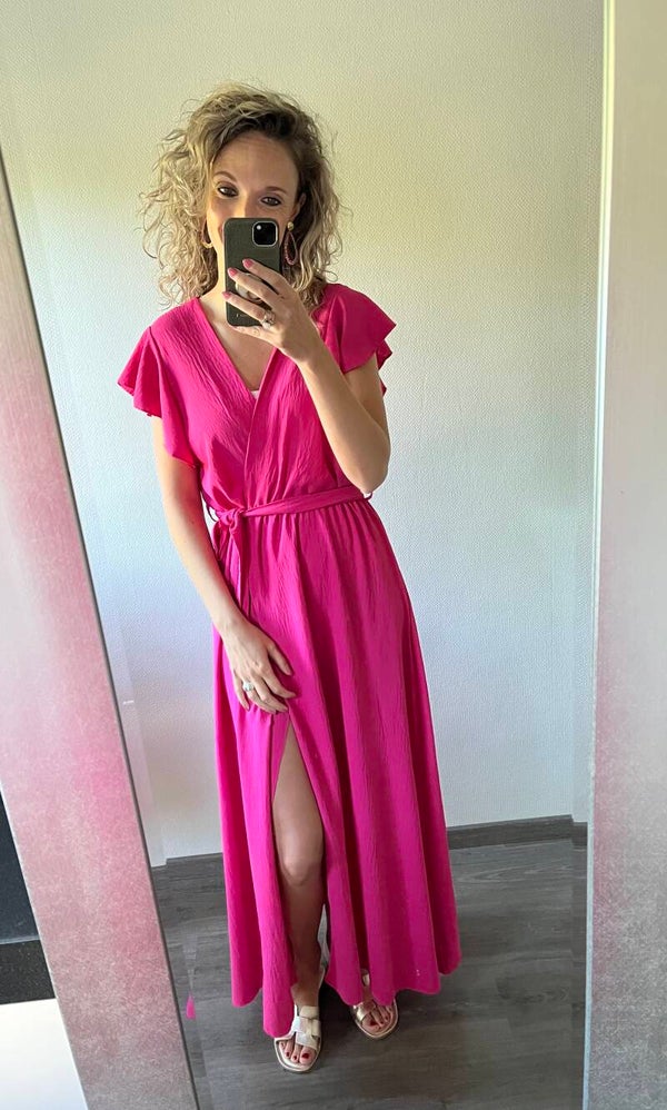Deze mooie lang jurk heeft een overslag welke vast zit. Iets een mouwtje en een koordje om de jurk mee te strikken. Deze kan je eraf laten doordat de jurk elastiek in de taille heeft. De jurk is one size•92% polyester •8% elastan