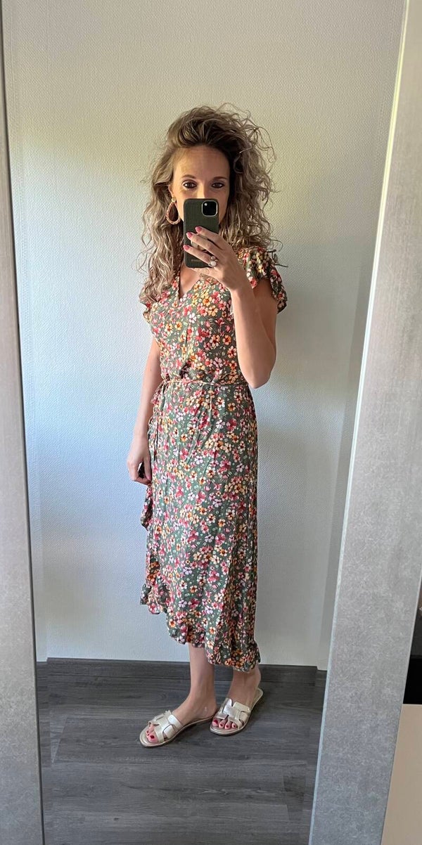 Deze overslag jurk heeft veel verschillende kleuren en daardoor met veel soorten accessoires leuk af te stylen. De jurk gaat in maten. Ons model draagt haar eigen maat.