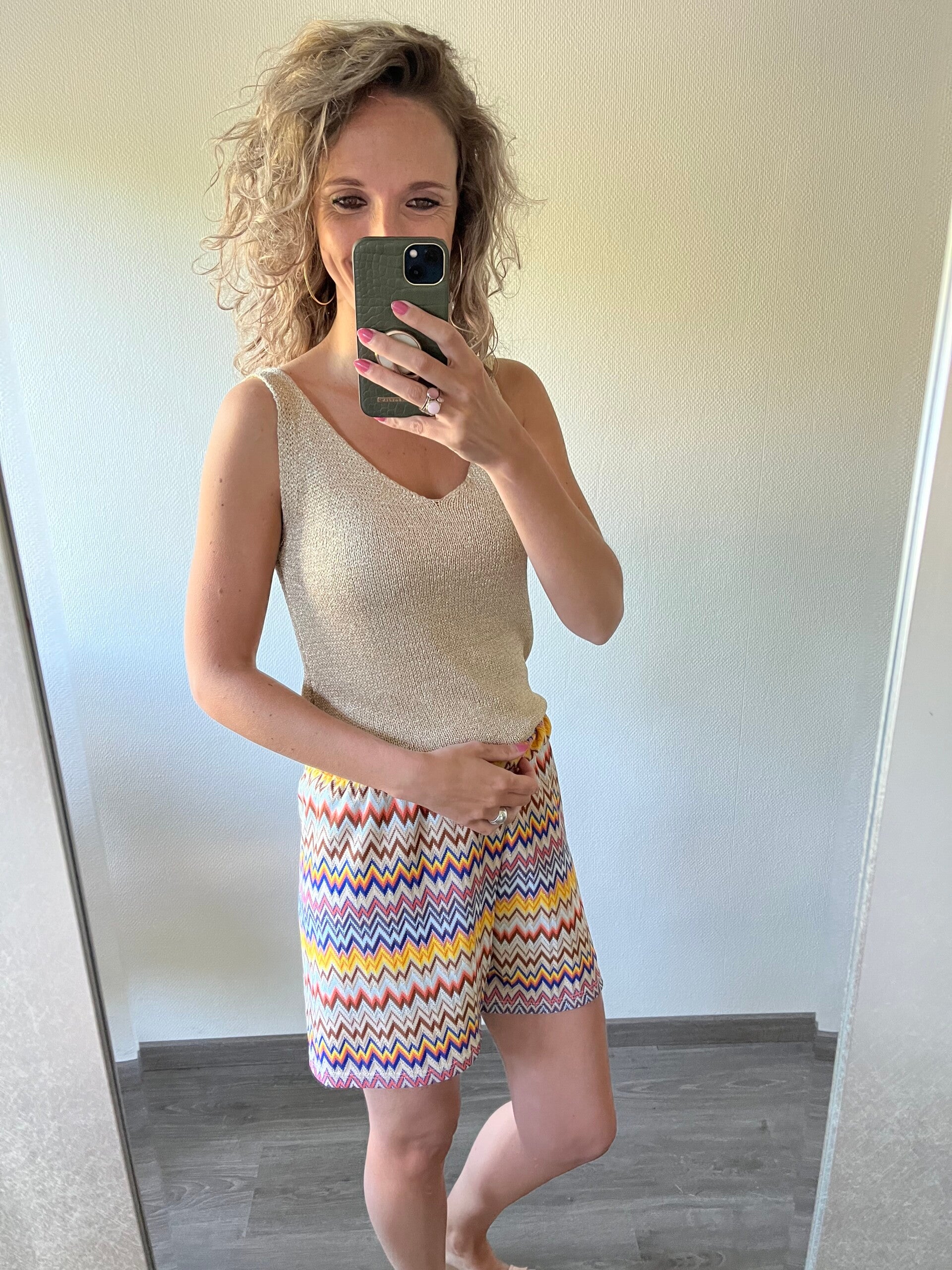 Dit shortje heeft veel verschillende kleuren wn een gouden lurex draadje. Heerlijk broekje in dragen. Dit broekje is one size en te dragen t/m maat 40
