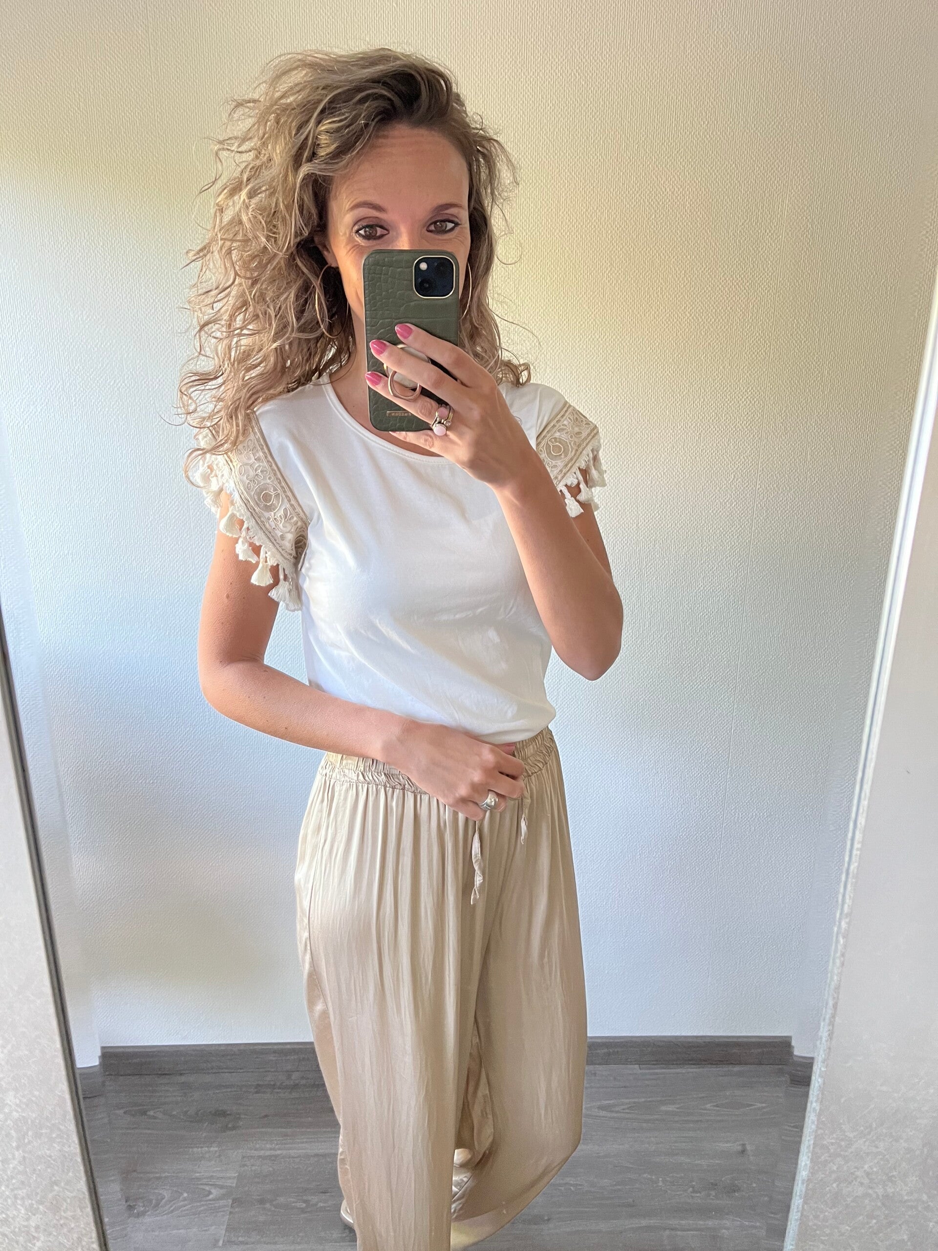 Deze heerlijk luchtige broek is in de gave kleur goud. Het is heerlijk zacht materiaal en helemaal de trend van nu. De broek is one size en te dragen t/m maat 40