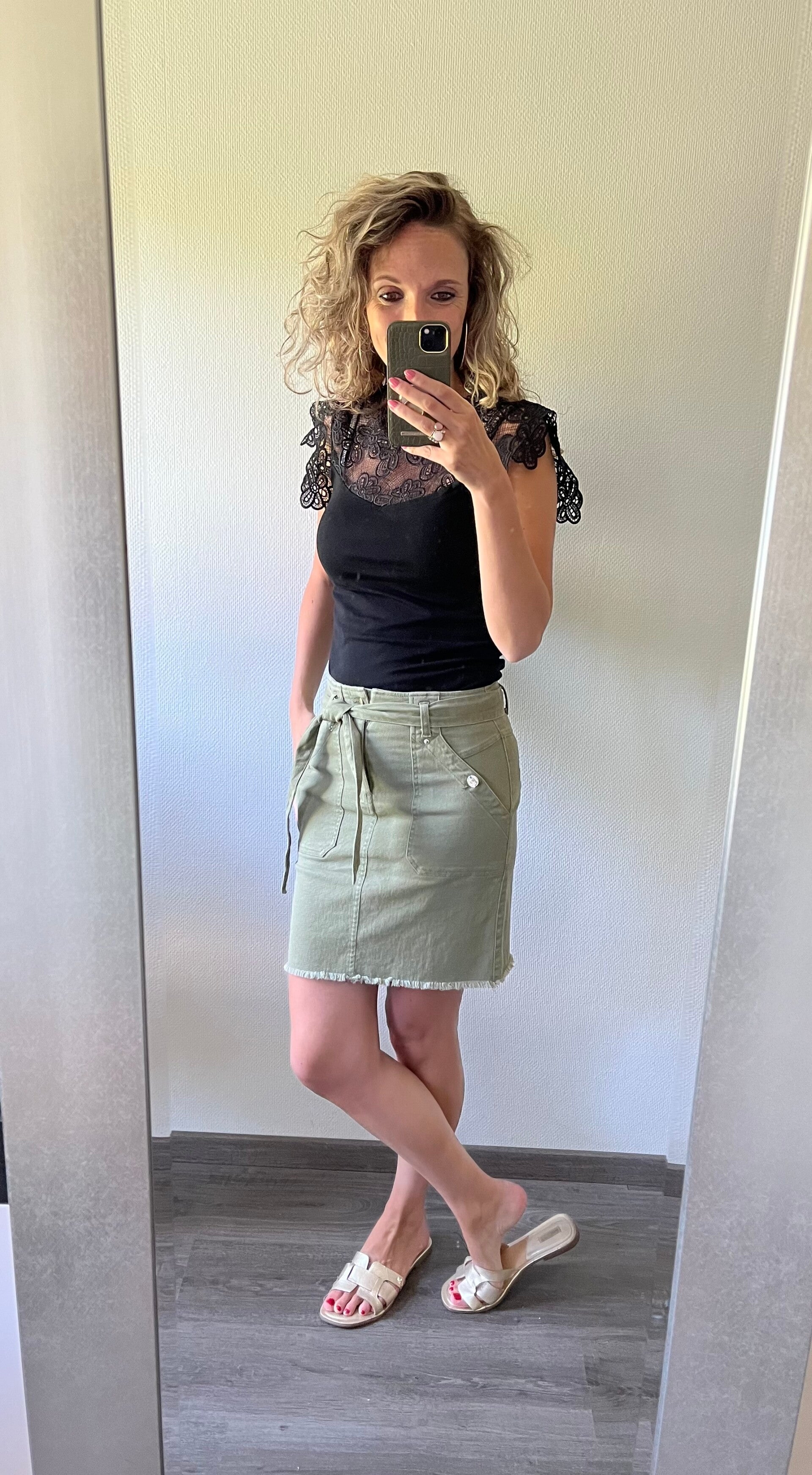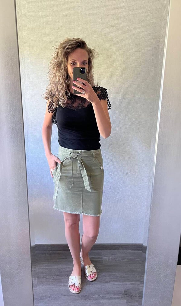 De riem/koord is eruit te verwijderen en te vervangen door bijvoorbeeld een leren riem. De rok bevat veel stretch, ook in de boord. Het valt op maat.