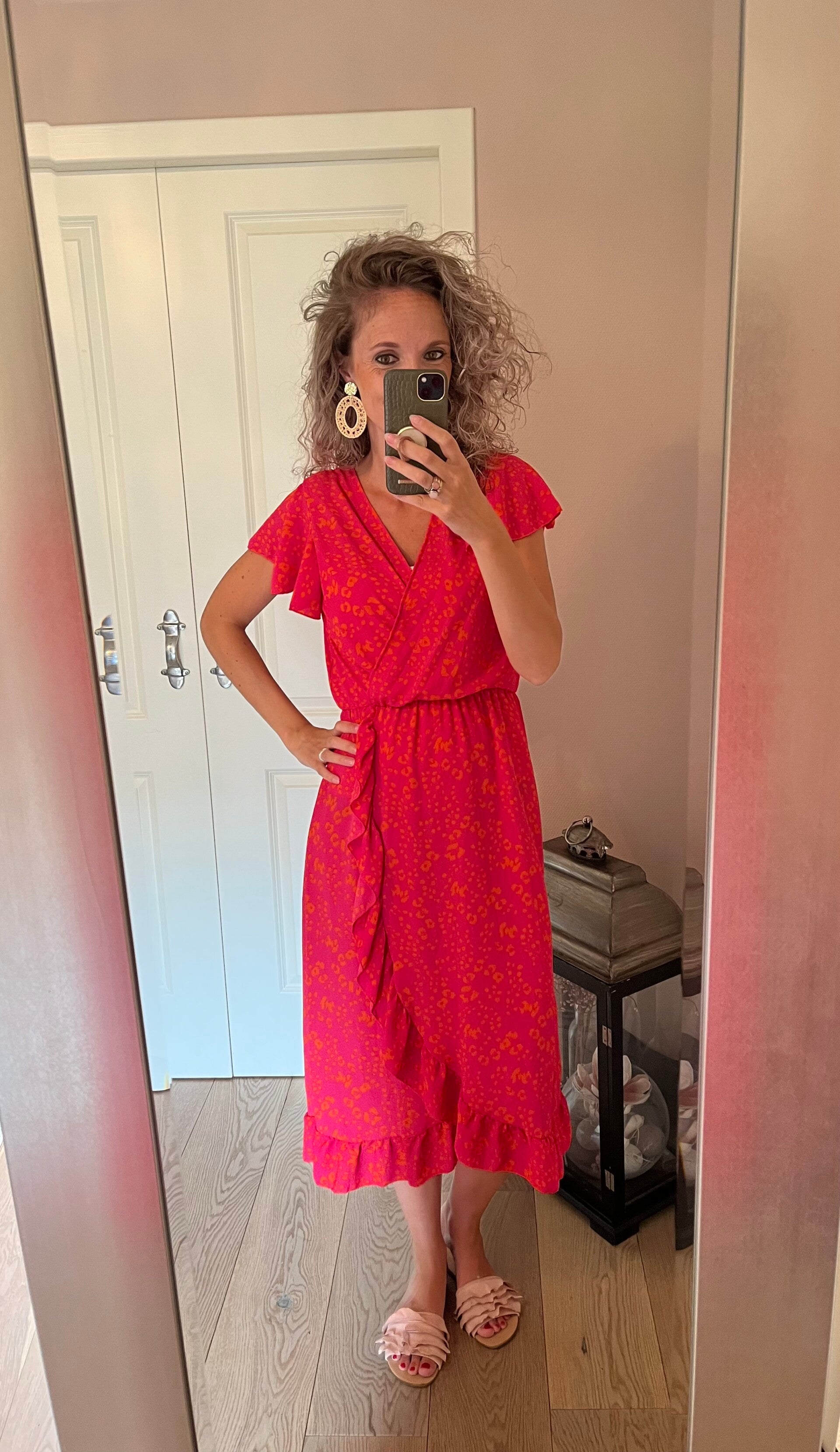 Deze leuke overslag jurk heeft een mooie kleur samenstelling van roze met oranje.Deze jurk gaat in de maten S/M L/XL