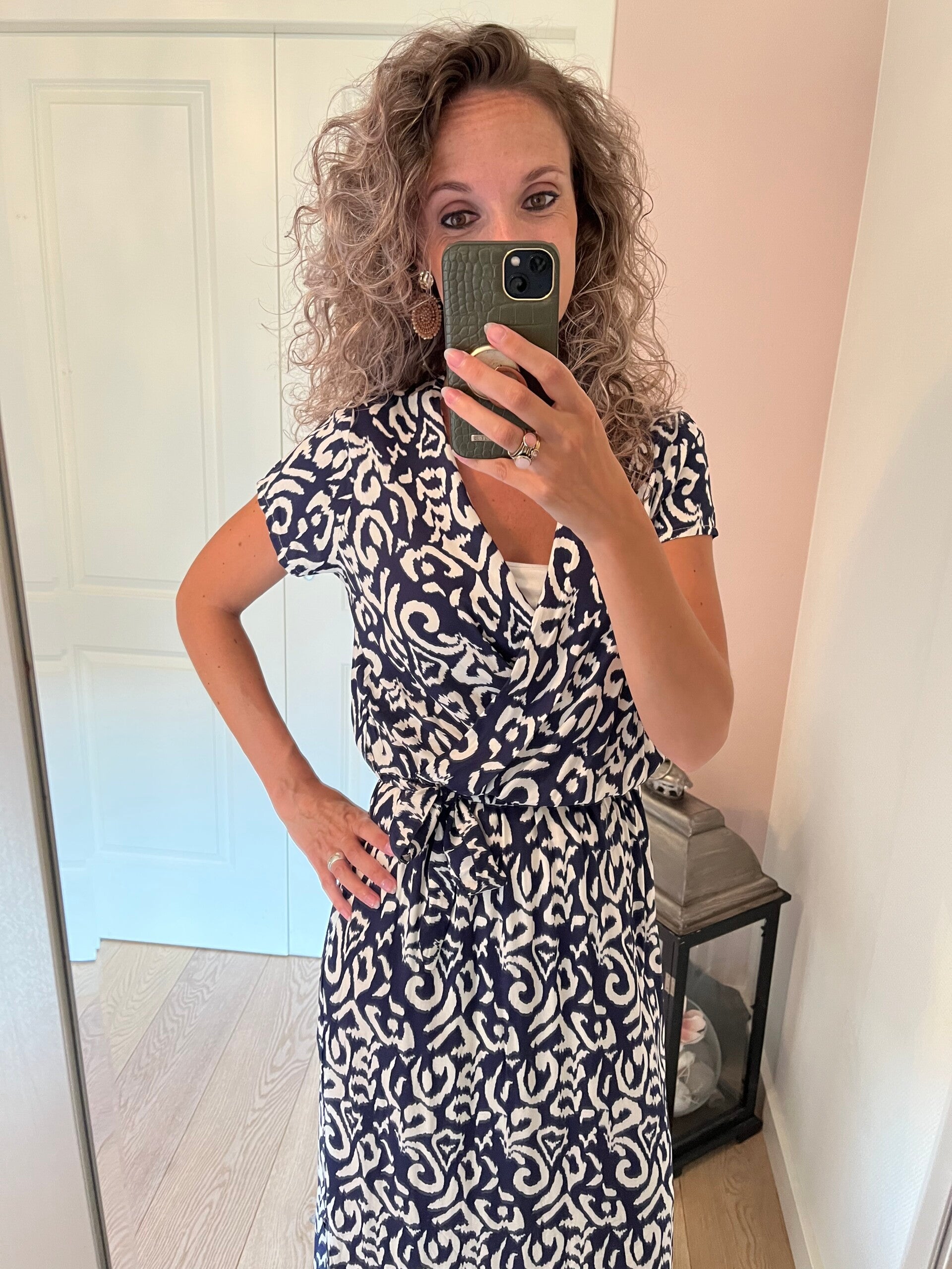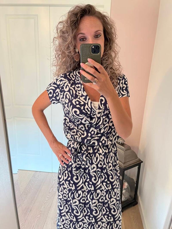 Hoe gaaf is deze jurk. Aan beide kanten een split, mooie V hals en een los strik ceintuur. Er zit elastiek in de taille waardoor deze mooie aangesloten zit. De jurk gaat in de maten S/M L/XL
