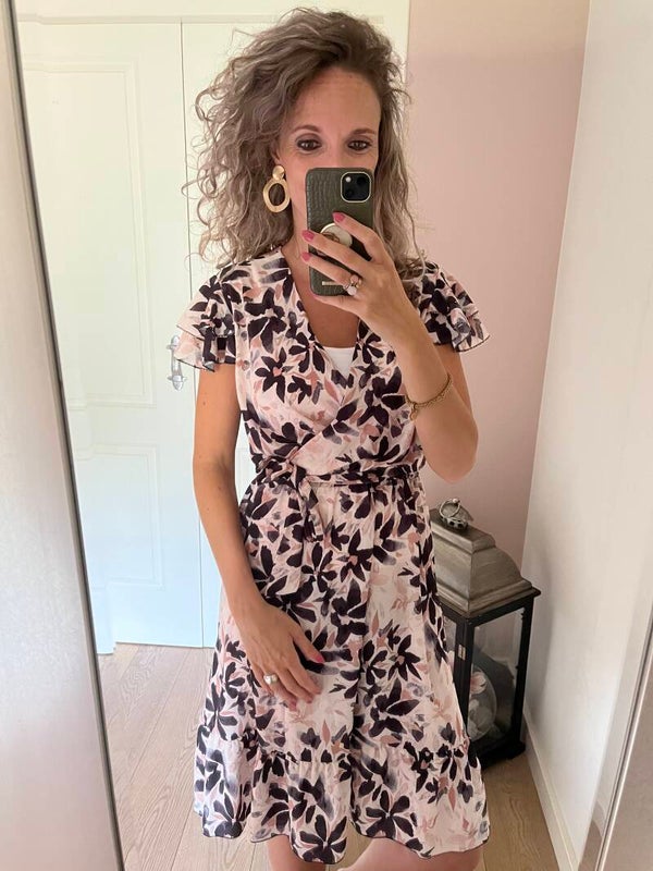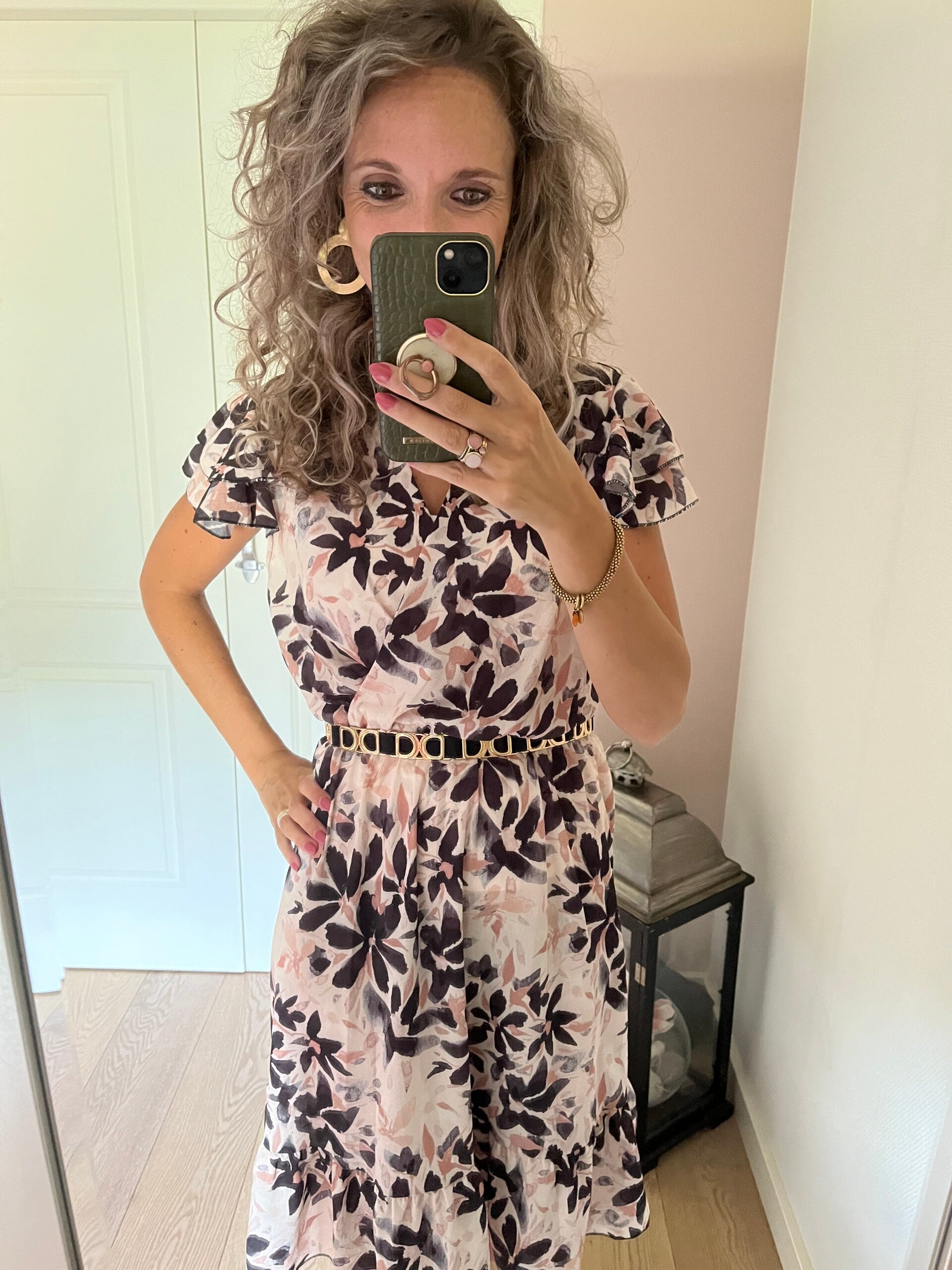 Door de mooie naturel tinten is dit jurkje makkelijk te combineren. Er zit een losse ceintuur bij, ook leuk te combineren met een andere riem(zie foto 3)