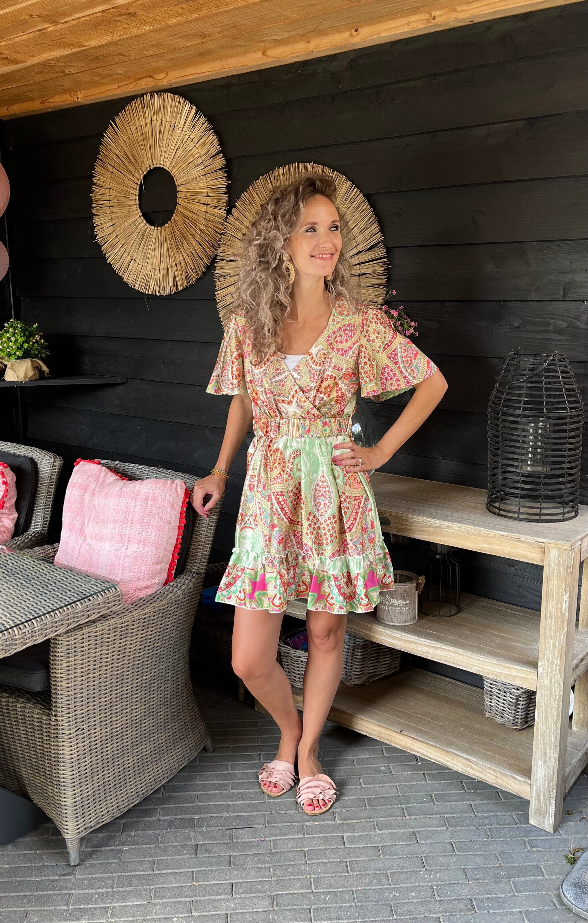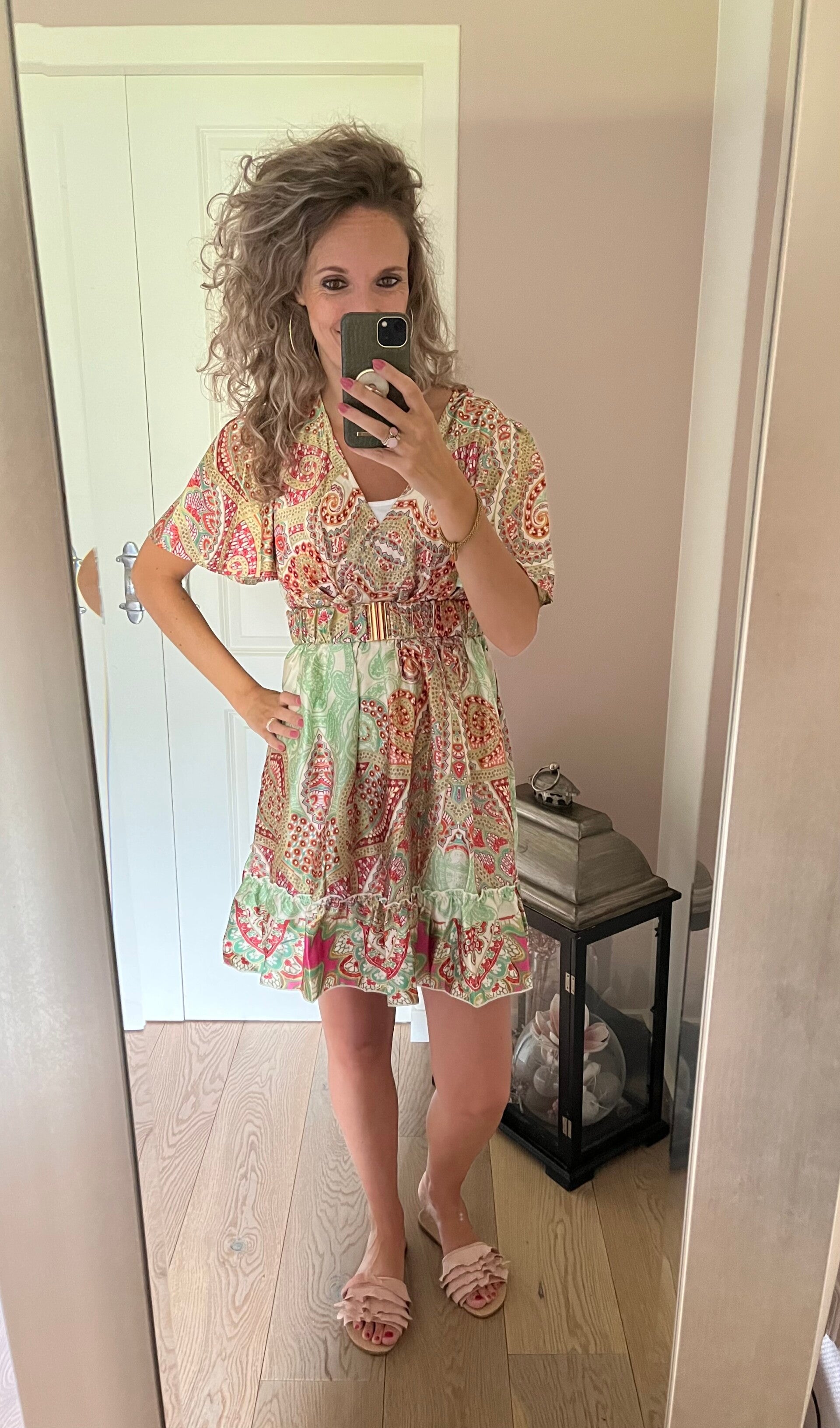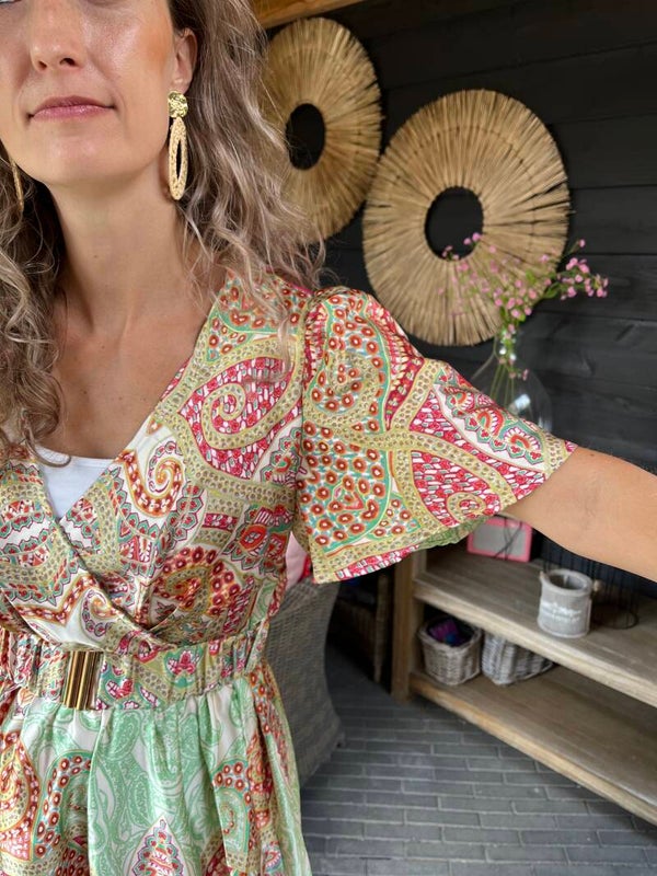 Hoe mooi is deze print. Heerlijk zomer jurkje met een mooi klein mouwtje en een bijpassende ceintuur. Zie jij jezelf al shinen met deze topper?