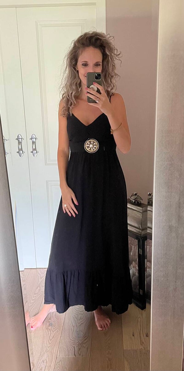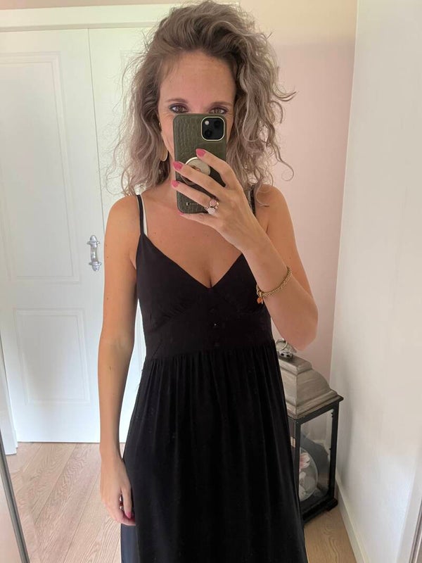 Heerlijk luchtig zomerjurkje. De bandjes zijn te verstellen. Mooi afgewerkt aan de voorzijde met knoopjes. Voor de dames die niet al te lang zijn, deze jurk is makkelijk korter te maken.