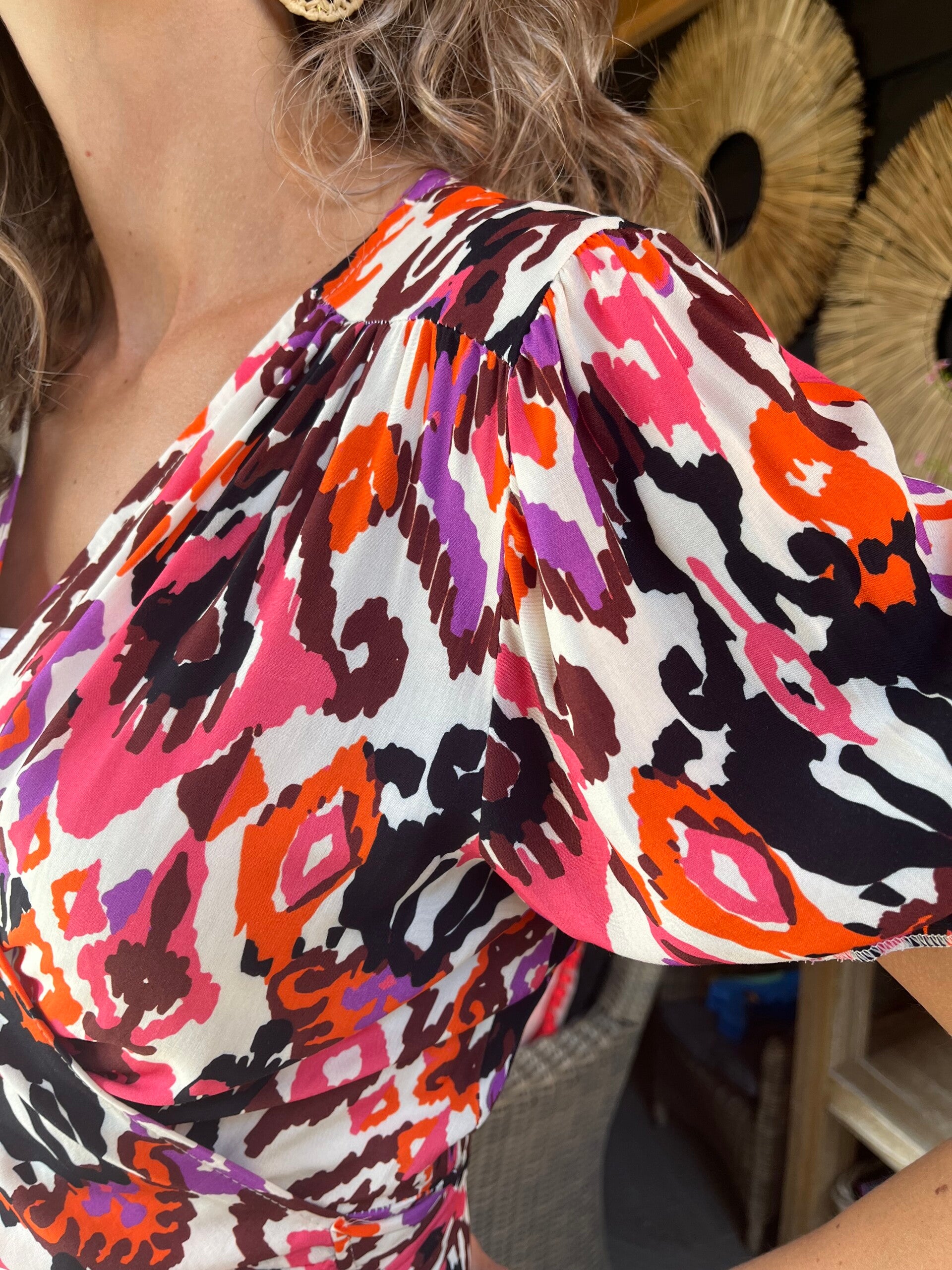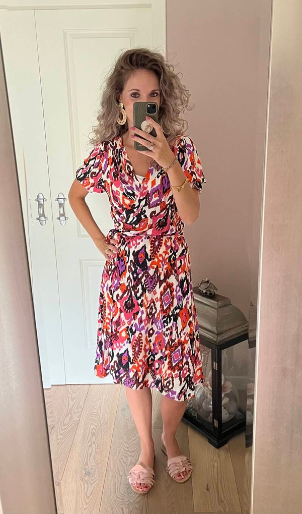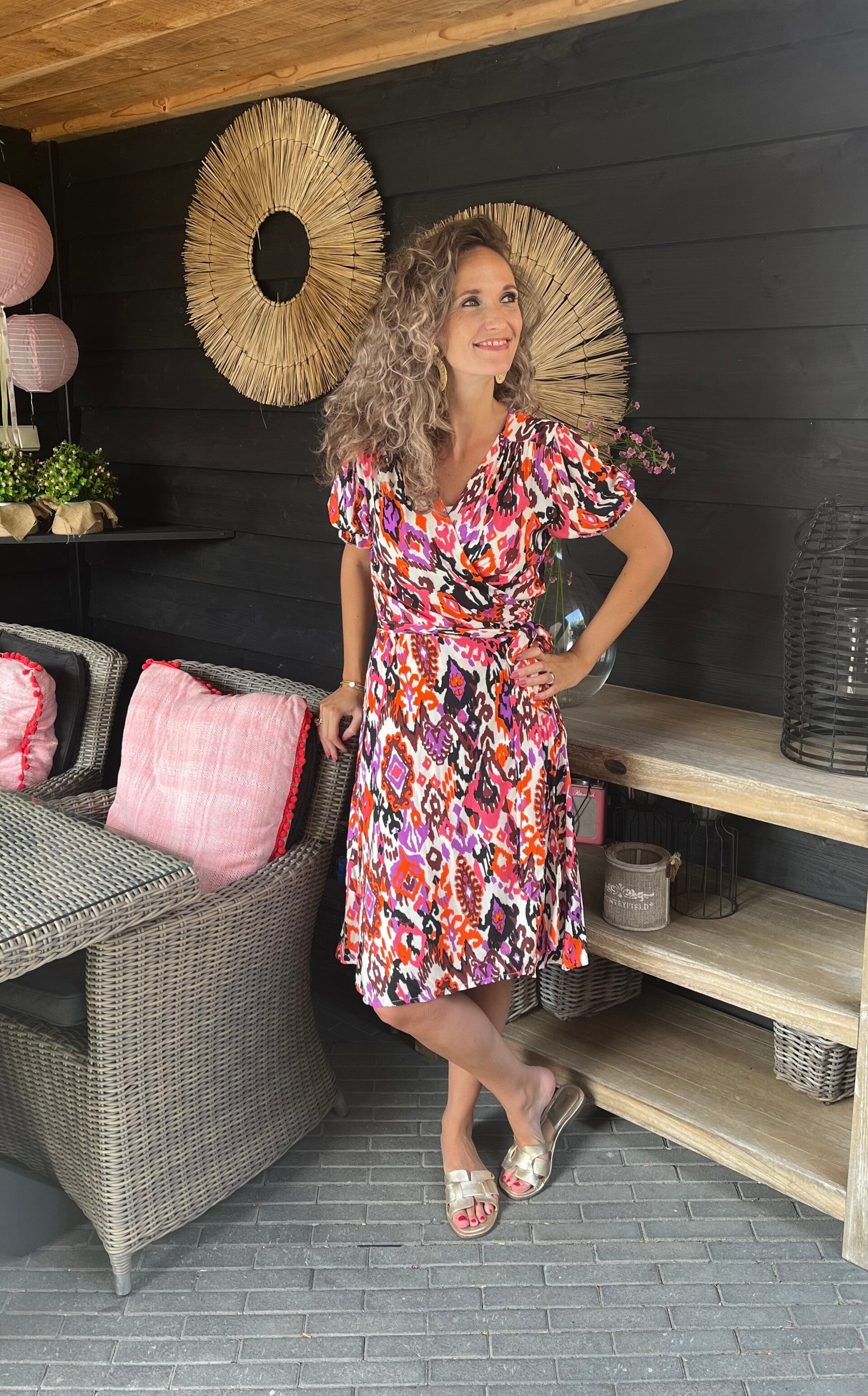 Hoe leuk is dit overslag jurkje! Een mooie kleur samenstelling en heerlijk in dragen. Door de vele kleuren kan je dit combineren met heel veel sieraden en schoenen. Dit jurkje gaat in maten.