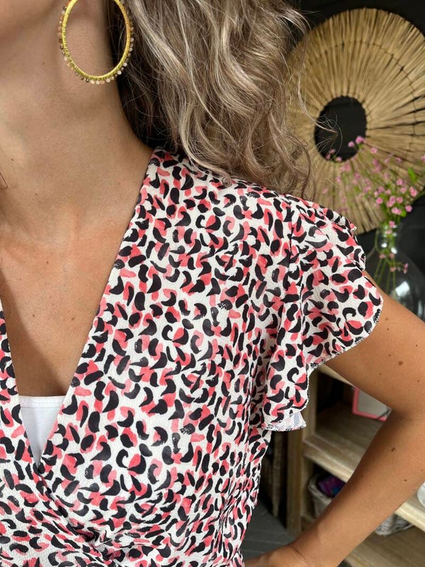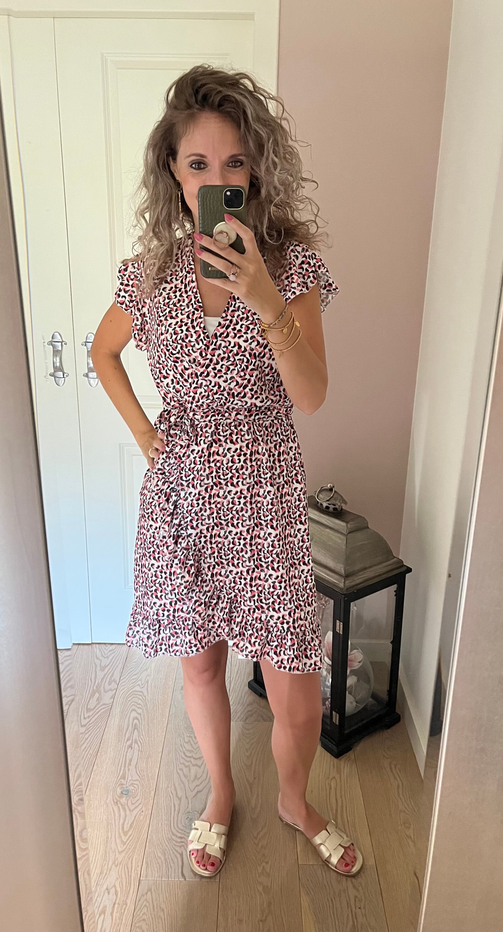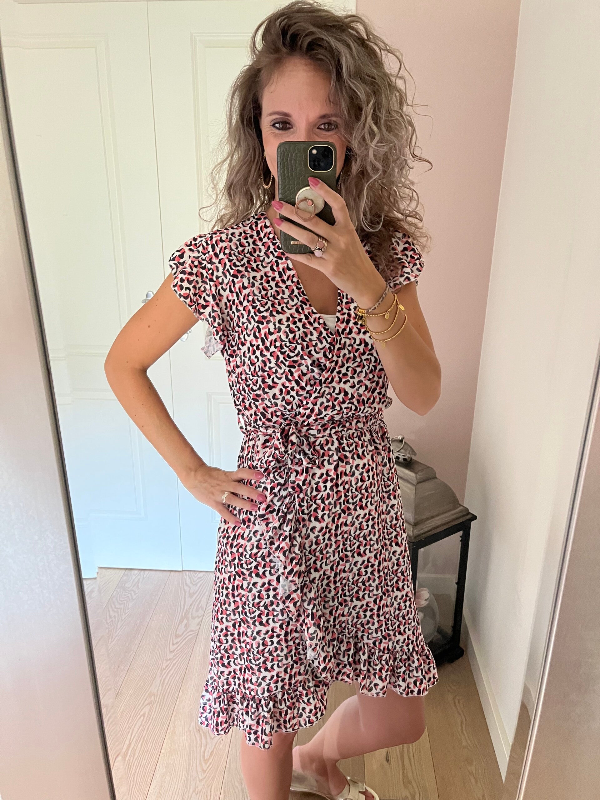 Dit leuke overslag jurkje heeft de overslag vast zitten. Hierdoor is het ook een ideaal jurkje om bijvoorbeeld mee te fietsen. Dit jurkje gaat in maten