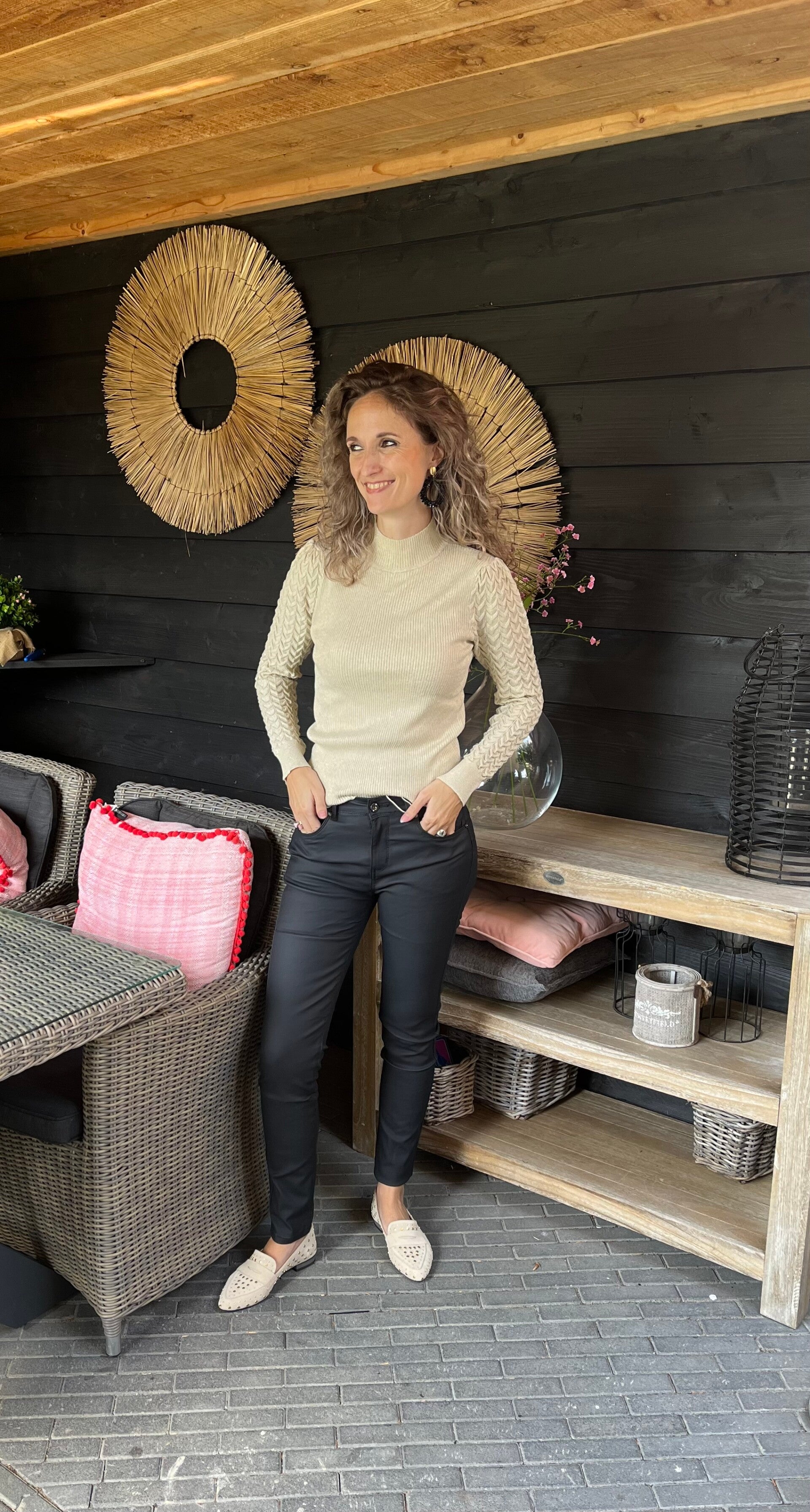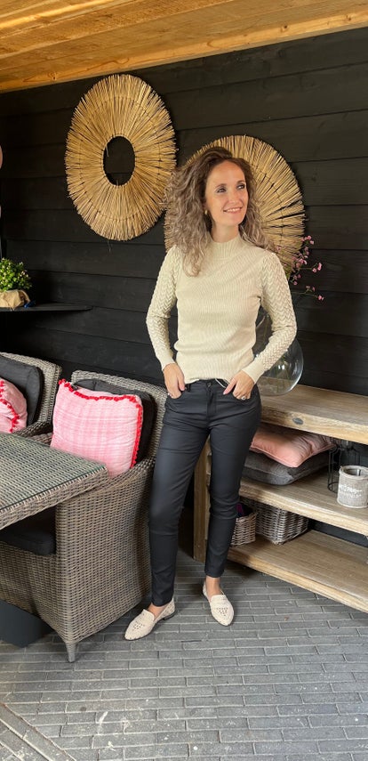 Deze fijne broek van de Norfy met coating laag valt goed op maat. De broek is een high waist en een slim jeans.