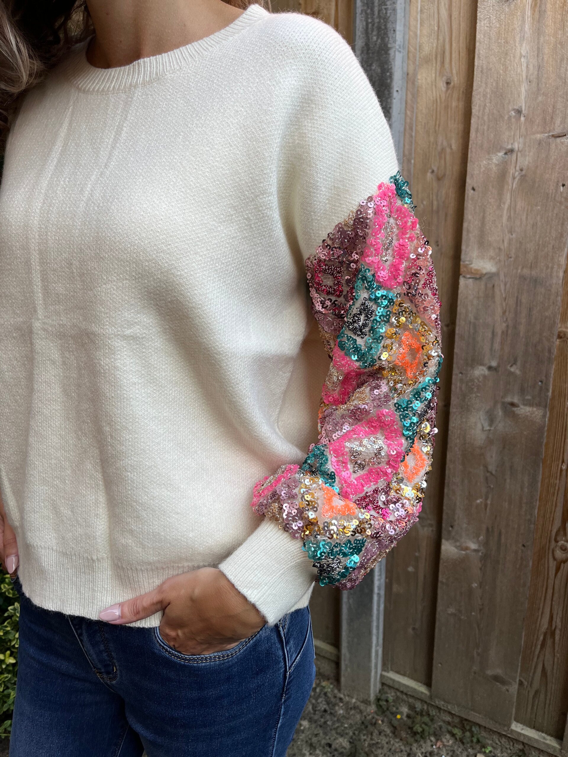 De trend van nu! Een stoere trui met bewerkte mouwen. Hoe gaaf is dan deze trui. Mooie afgewerkt met pailletten in meerdere kleuren. Binnenzijde van de mouwen zijn zacht waardoor je dit niet merkt met dragen.