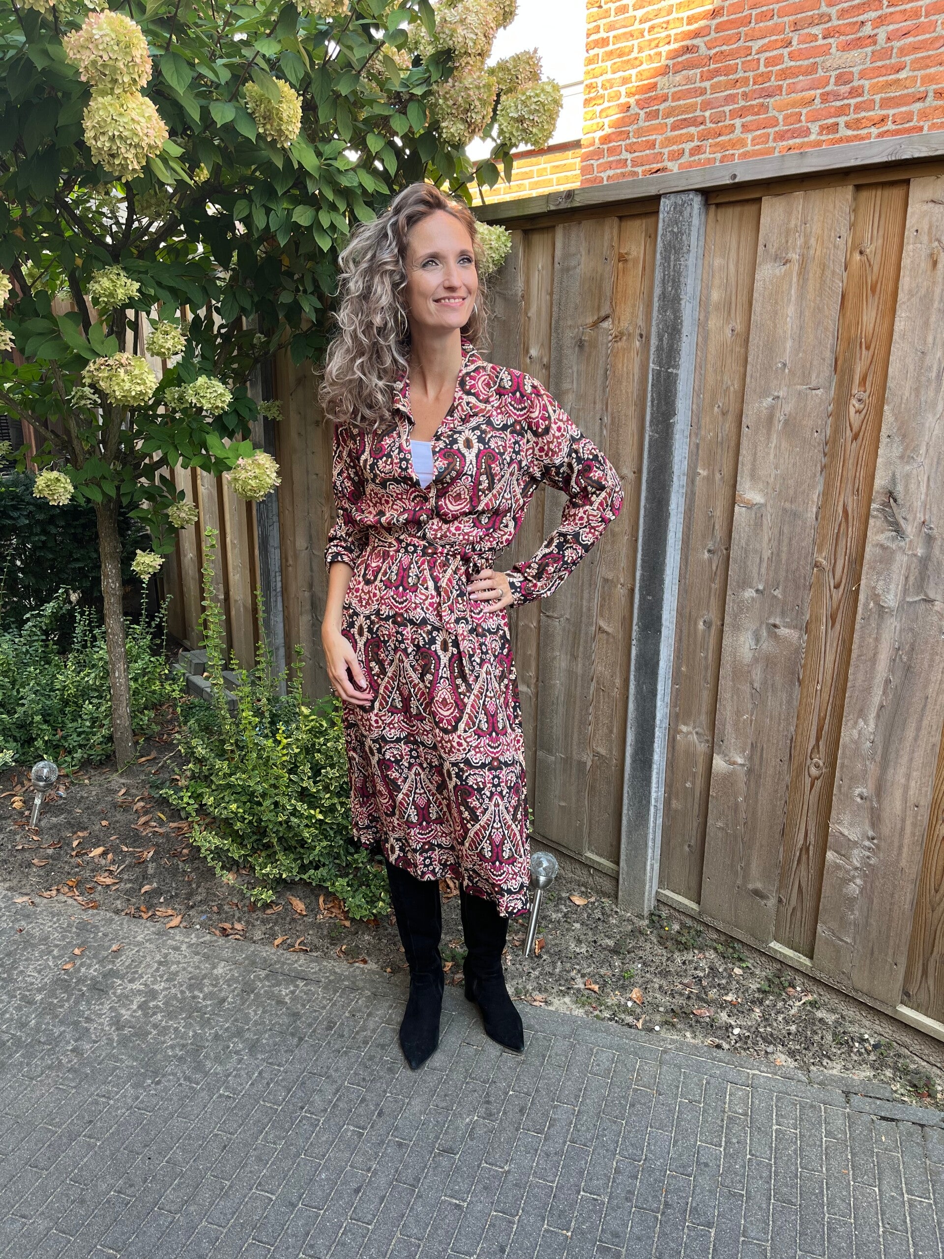 Leuke print jurk met aan de bovenzijde knoopjes. Mooi qua lente en draagt heerlijk qua materiaal. Er zit een ceintuur van het zelfde materiaal/print bij.