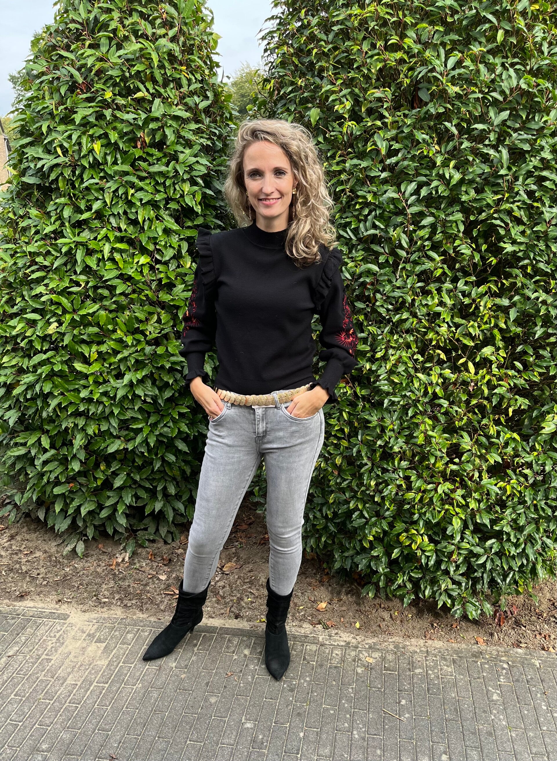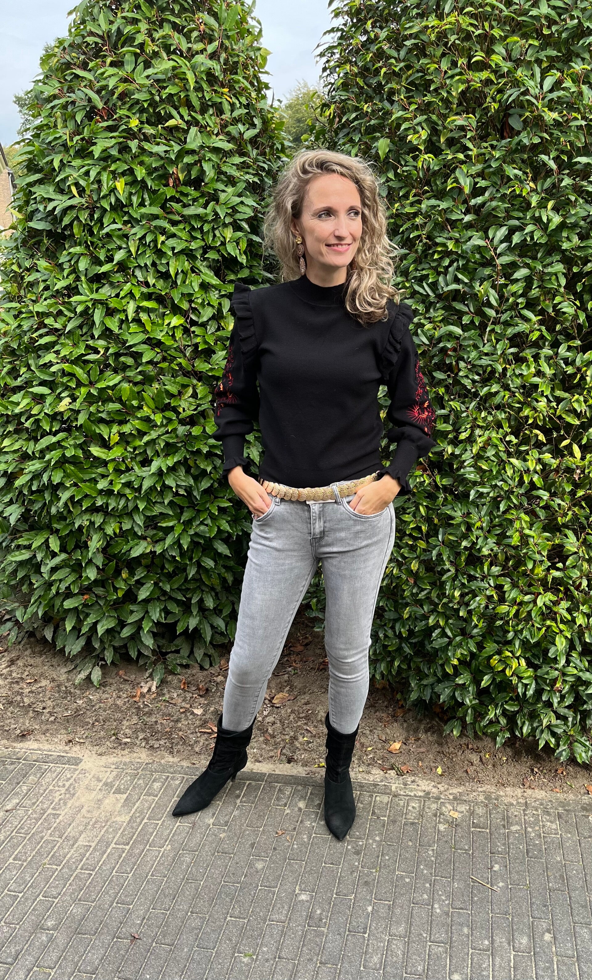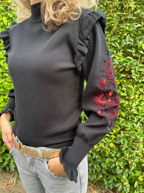 Deze trui is heerlijk zacht aan op de huid. De mouwen hebben een leuk borduursel en onder een kleine roesel. Ook op de schouder zit een roesel. De trui gaat in maten en valt op maat.