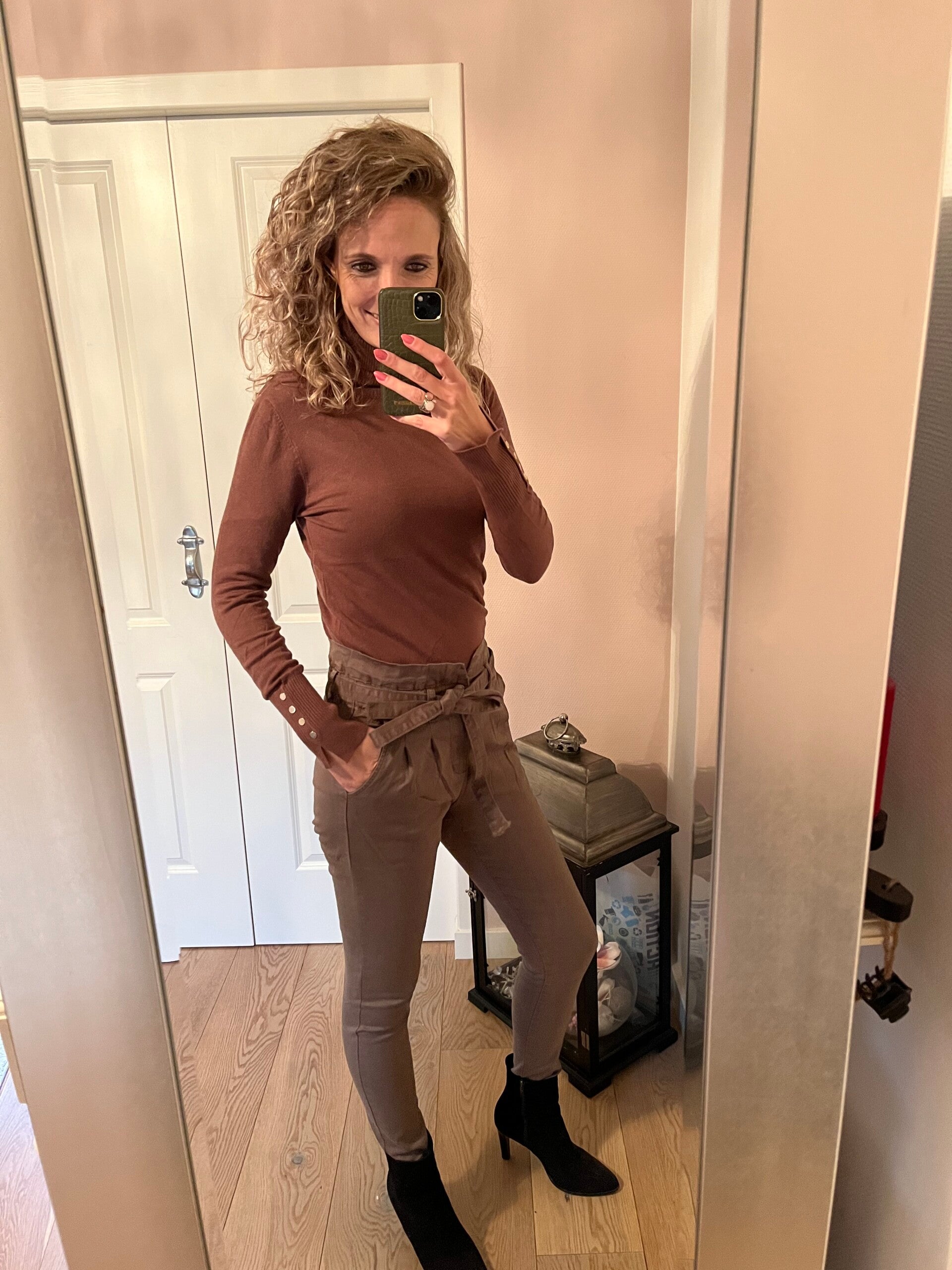 De broek valt op maat, ons model draagt haar eigen maat. Maat S