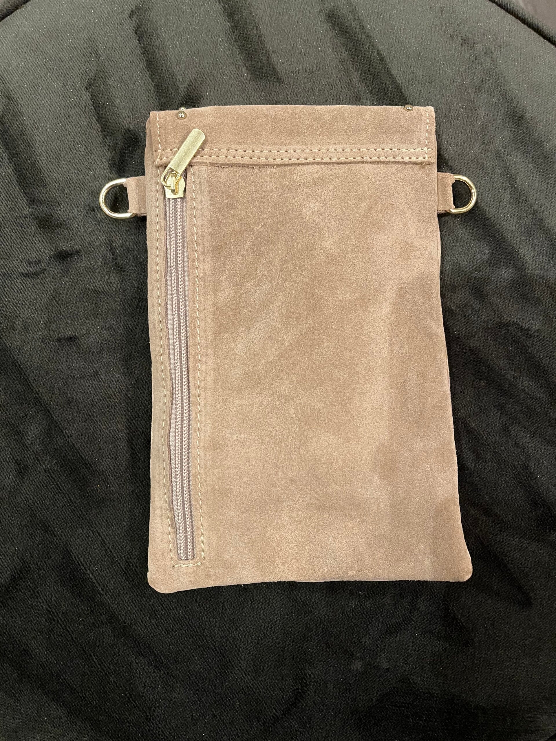 Deze suède tas heeft een bijpassende Strap. Aan de achterzijde zit een rits waar je pasjes of geld in op kan bergen.