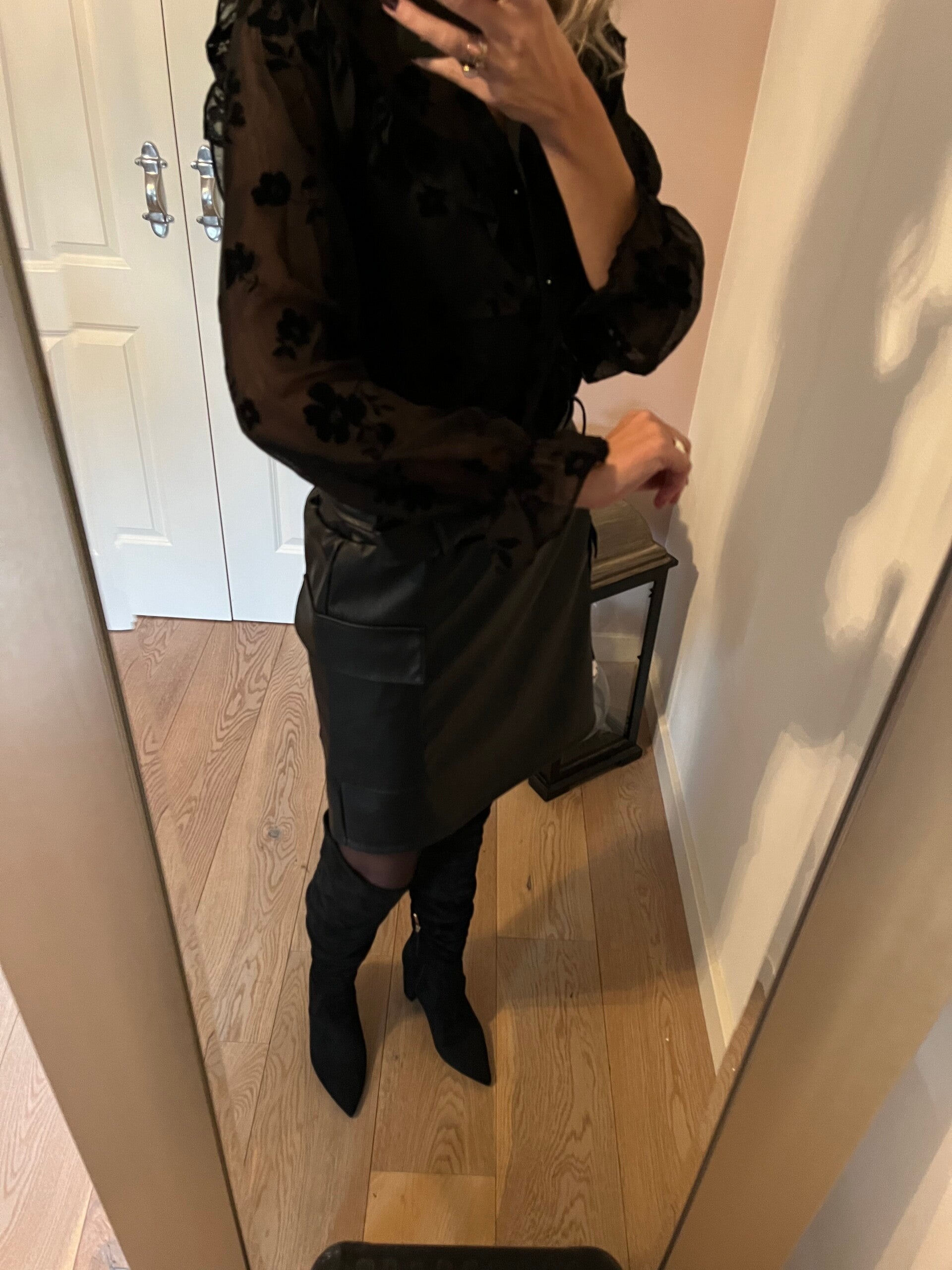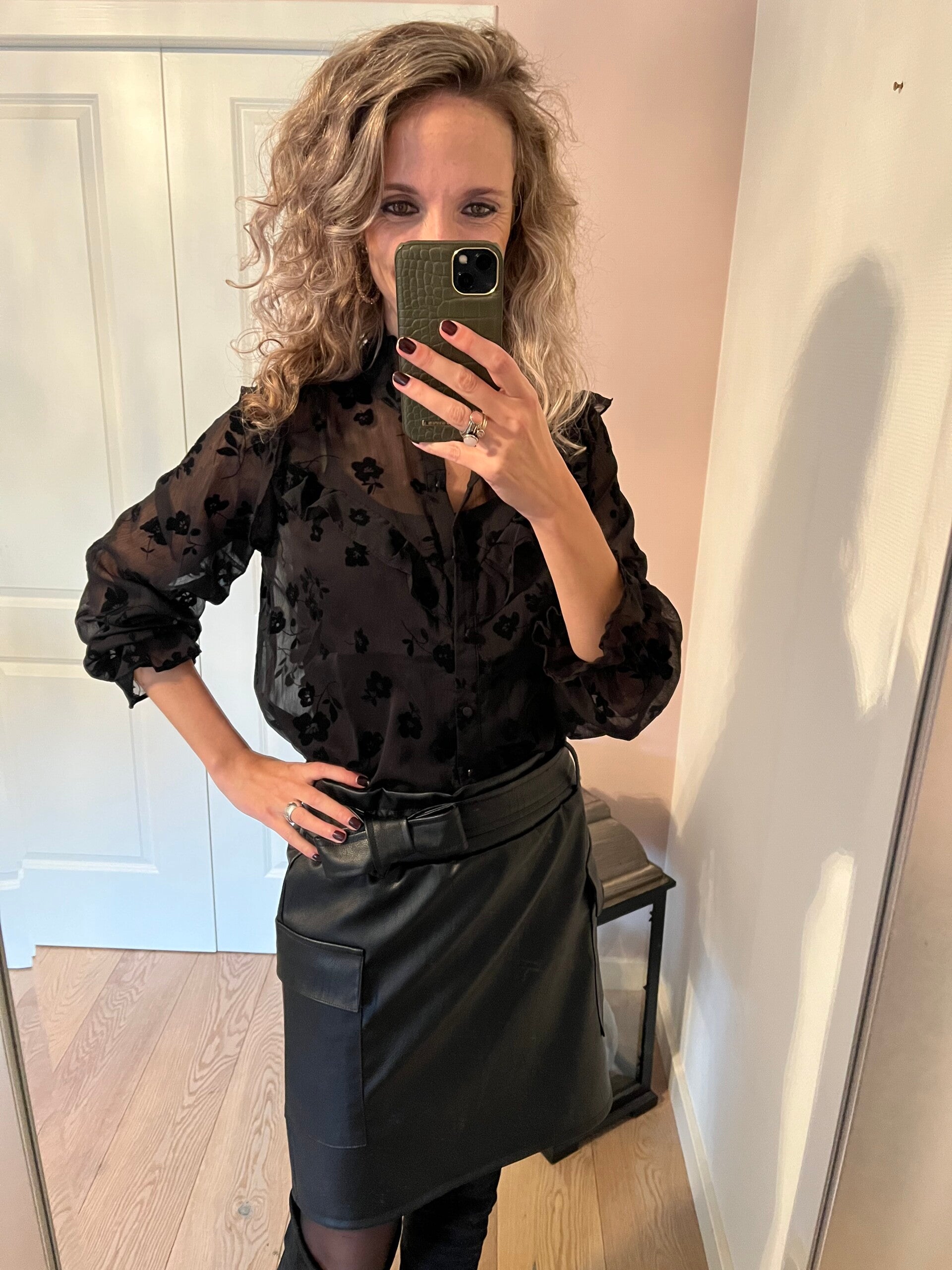 Deze stoere leather look rok heeft aan beide kanten platte cargo zakken. De trend van nu! De rok heeft een elastieken band en draagt daardoor top! Er wordt in hetzelfde materiaal een ceintuur meegeleverd.