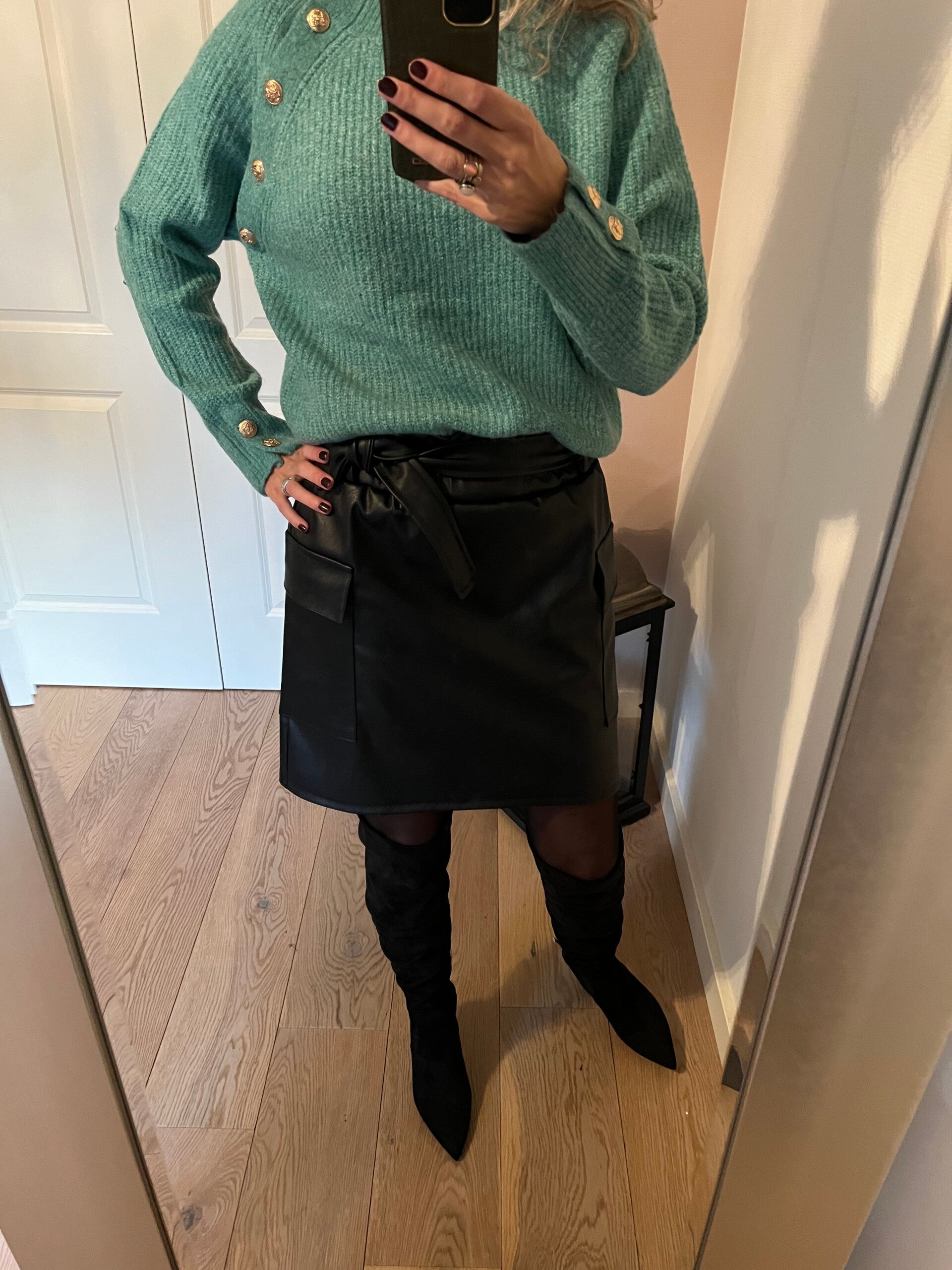 Deze stoere leather look rok heeft aan beide kanten platte cargo zakken. De trend van nu! De rok heeft een elastieken band en draagt daardoor top! Er wordt in hetzelfde materiaal een ceintuur meegeleverd.