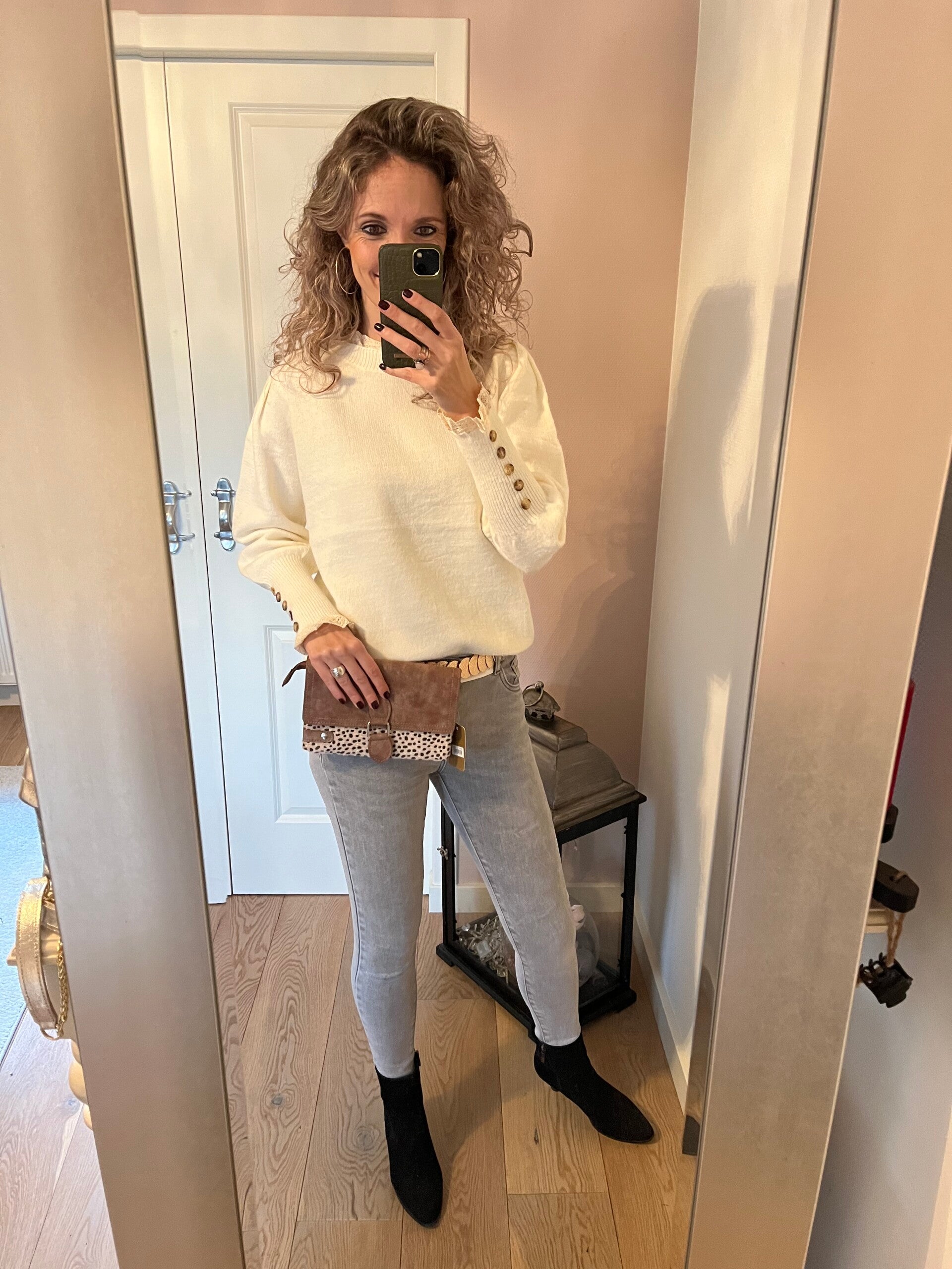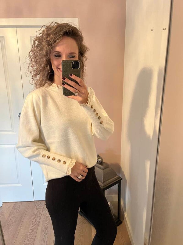 Deze trui is heerlijk zacht aan en heeft leuke details aan de mouwen en hals. Deze trui is one size en te dragen t/m mt 40/42