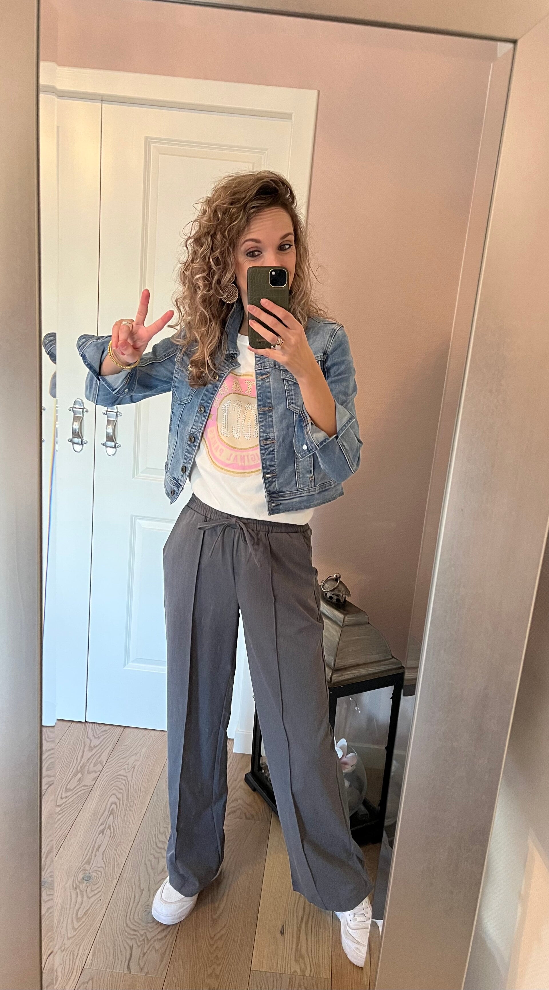 De spijkerjasjes gaan in maten. Ons model draagt haar eigen maat.