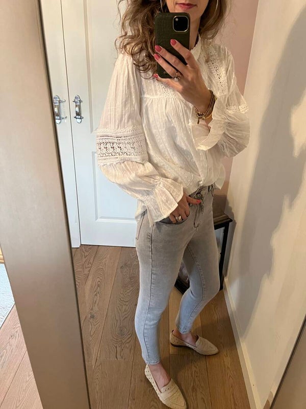 Hoe ontzettend leuk is deze blouse afgewerkt. Kant in de mouwen, kant op de voorzijde. Elastiek onderin de mouw waardoor de blouse makkelijk op te halen is.