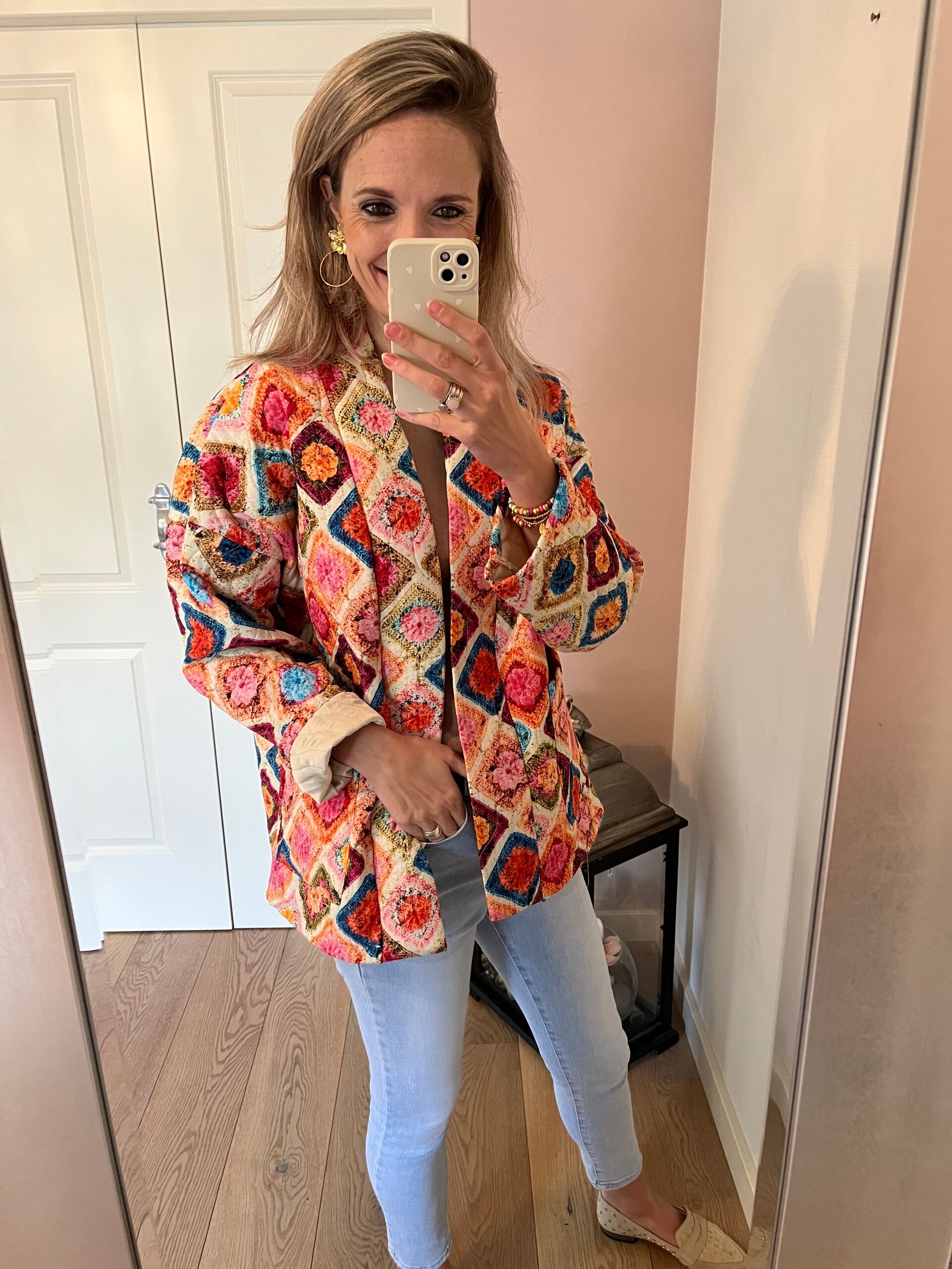 Hoe gaaf is dit jasje! Heerlijk in dragen en mooi ik kleur samenstelling! Gaaf op een jeans of lichte broek. Het jasje is one size en te dragen t/m mt 42
