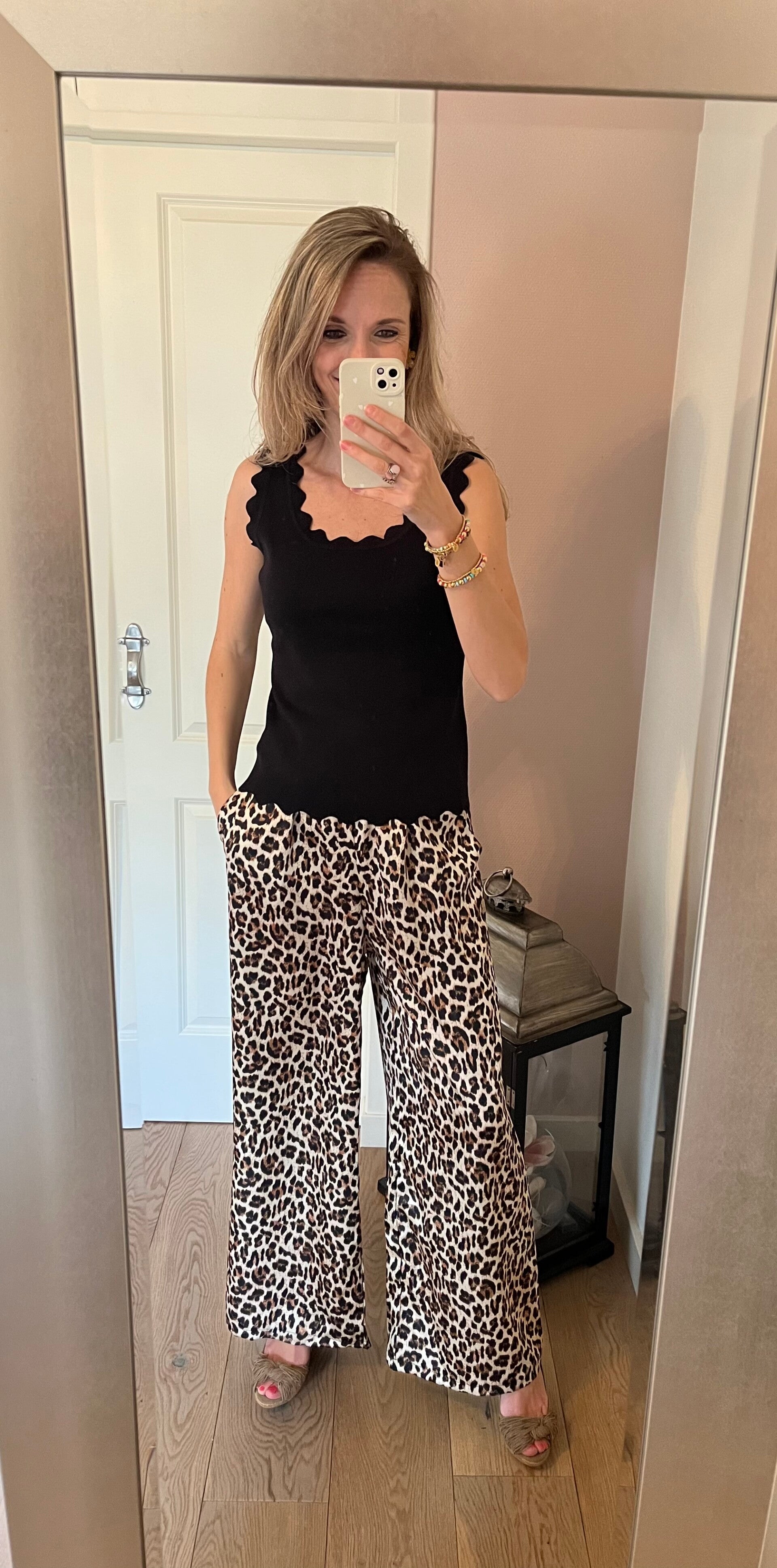 Deze trend mag niet ontbreken in jouw garderobe. PANTER! En hoe leuk is het dan in een broek. Deze fijne wijd vallende broek heeft een elastieken boord en twee zakken aan de voorzijde. De broek is one size en te dragen t/m mt 40/42