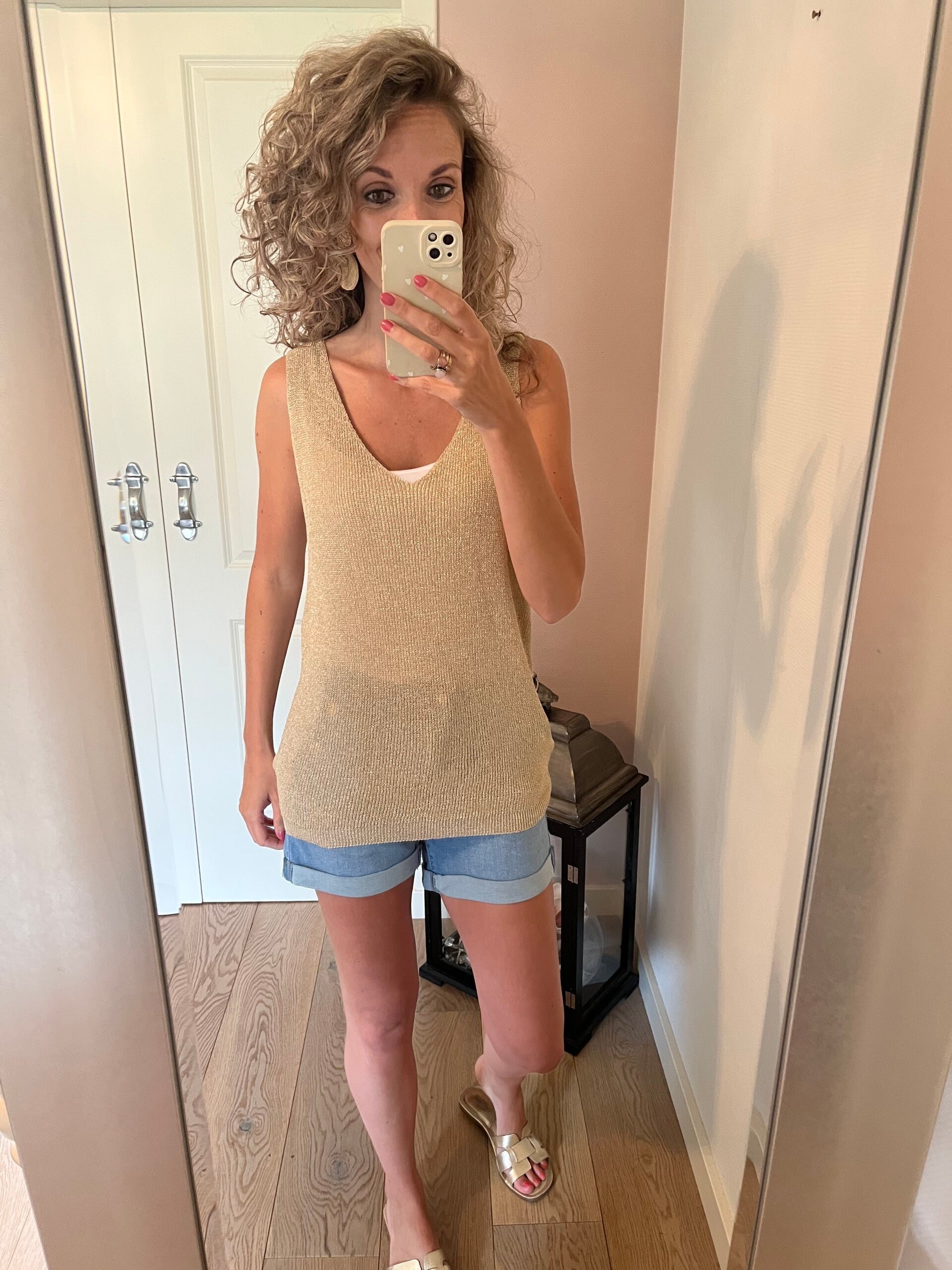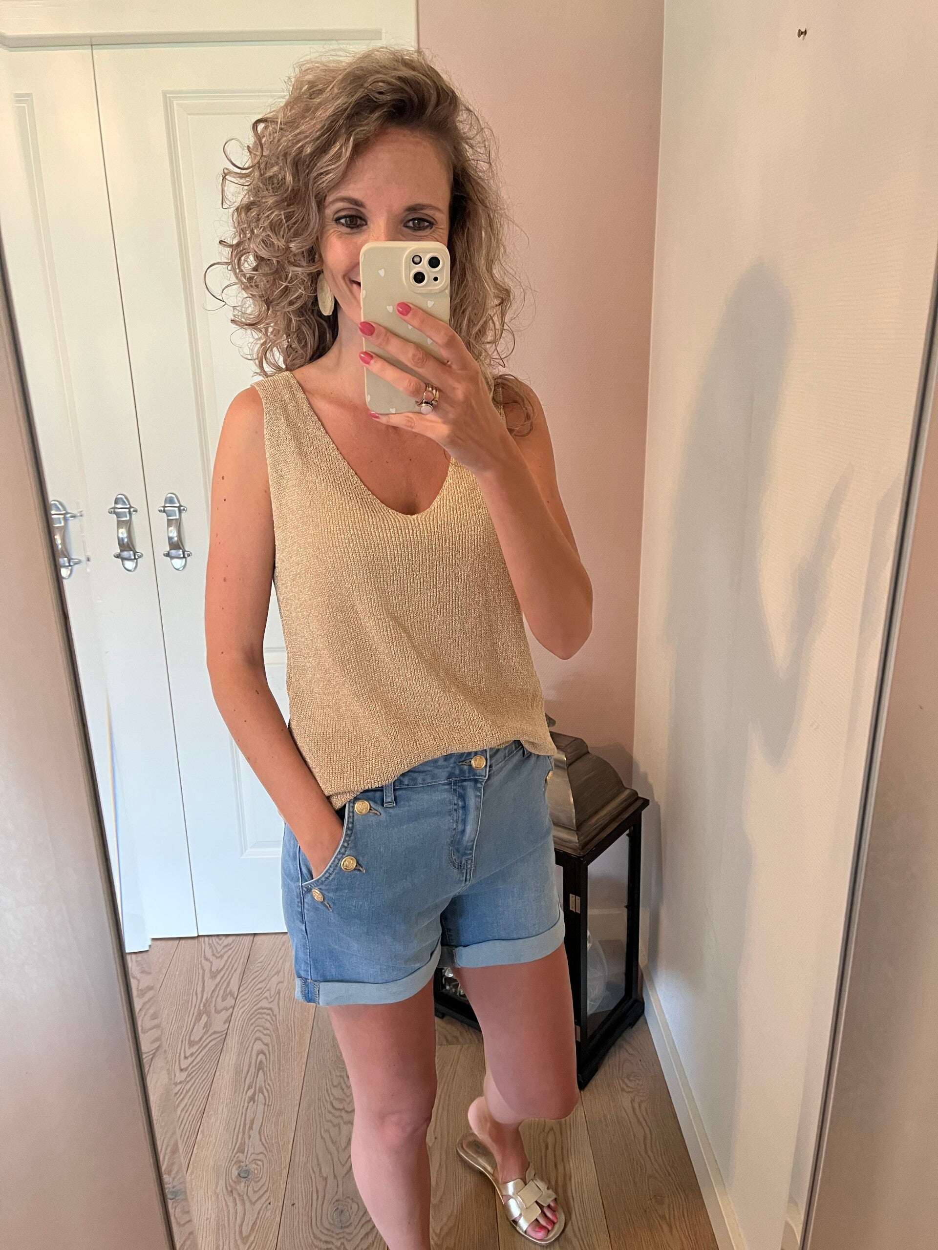 Deze korte jeans met stretch heeft een omslag welke vast zit en heeft leuke details met de gouden knopen op de zakken. De korte broek valt op maat, ons model draagt haar eigen maat.