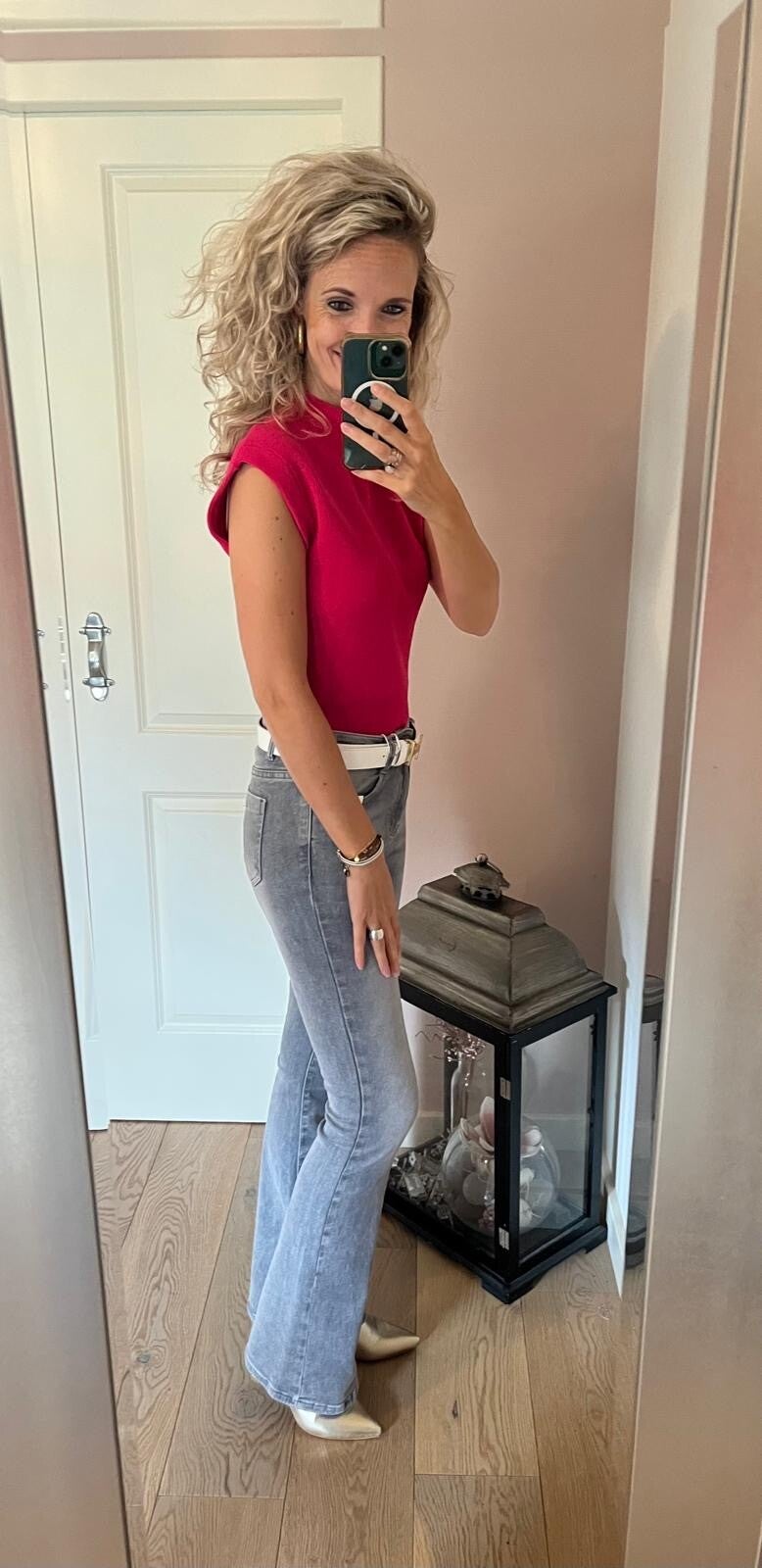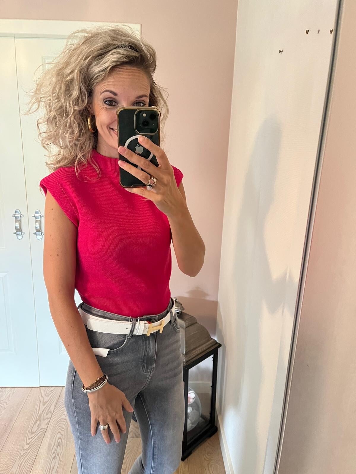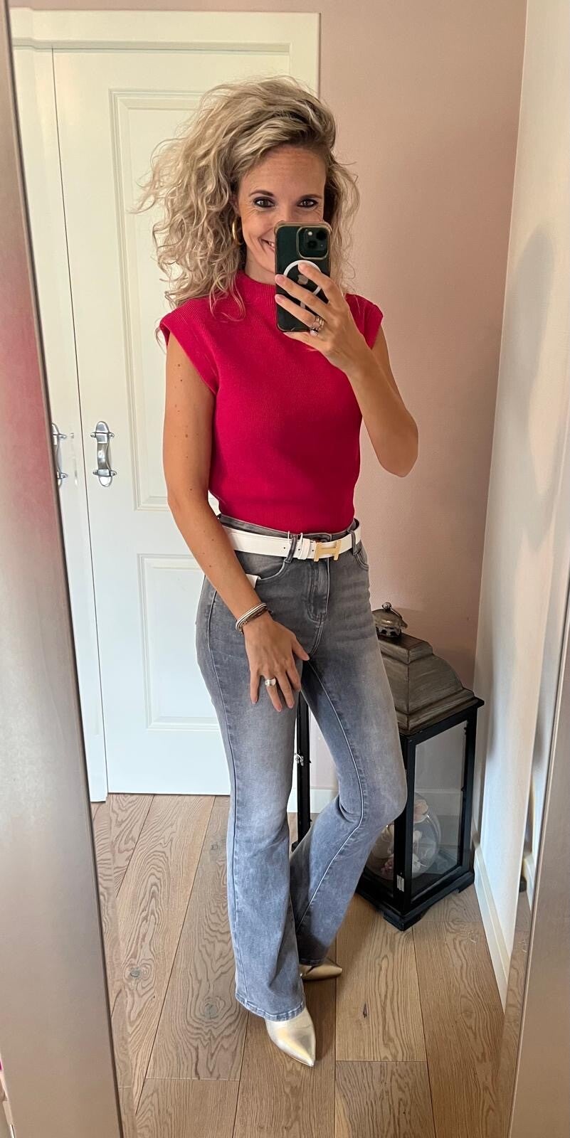 Deze korte jeans met stretch heeft een omslag welke vast zit en heeft leuke details met de gouden knopen op de zakken. De korte broek valt op maat, ons model draagt haar eigen maat.