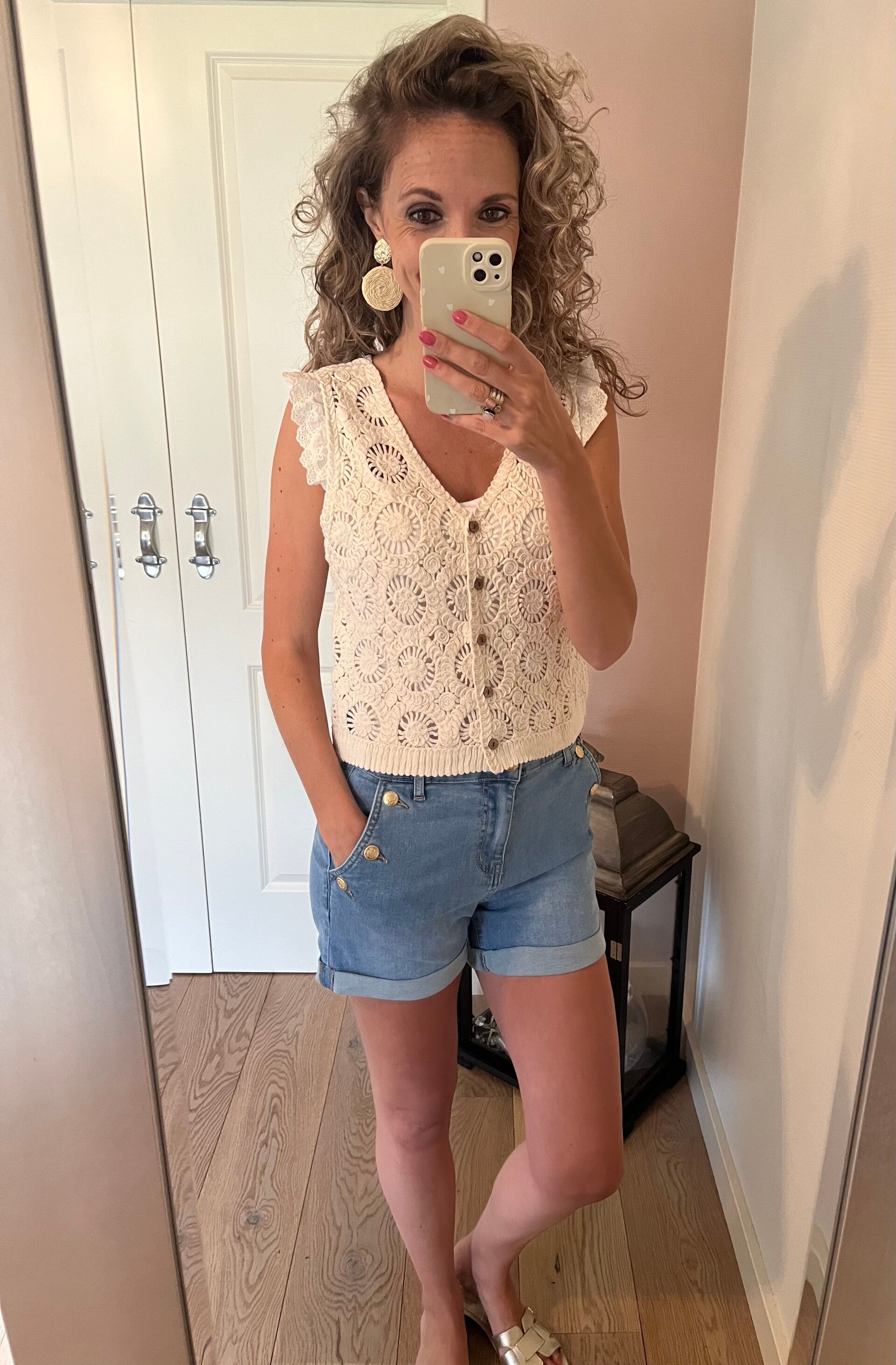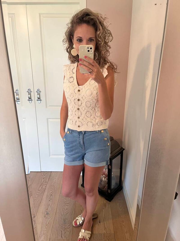 Deze korte jeans met stretch heeft een omslag welke vast zit en heeft leuke details met de gouden knopen op de zakken. De korte broek valt op maat, ons model draagt haar eigen maat.