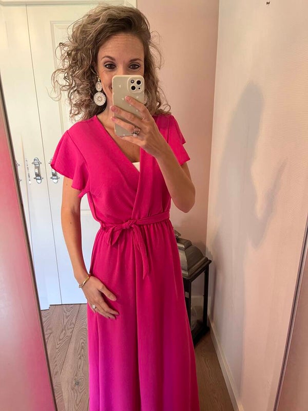 Deze mooie lang jurk heeft een overslag welke vast zit. Iets een mouwtje en een koordje om de jurk mee te strikken. Deze kan je eraf laten doordat de jurk elastiek in de taille heeft. De jurk is one size