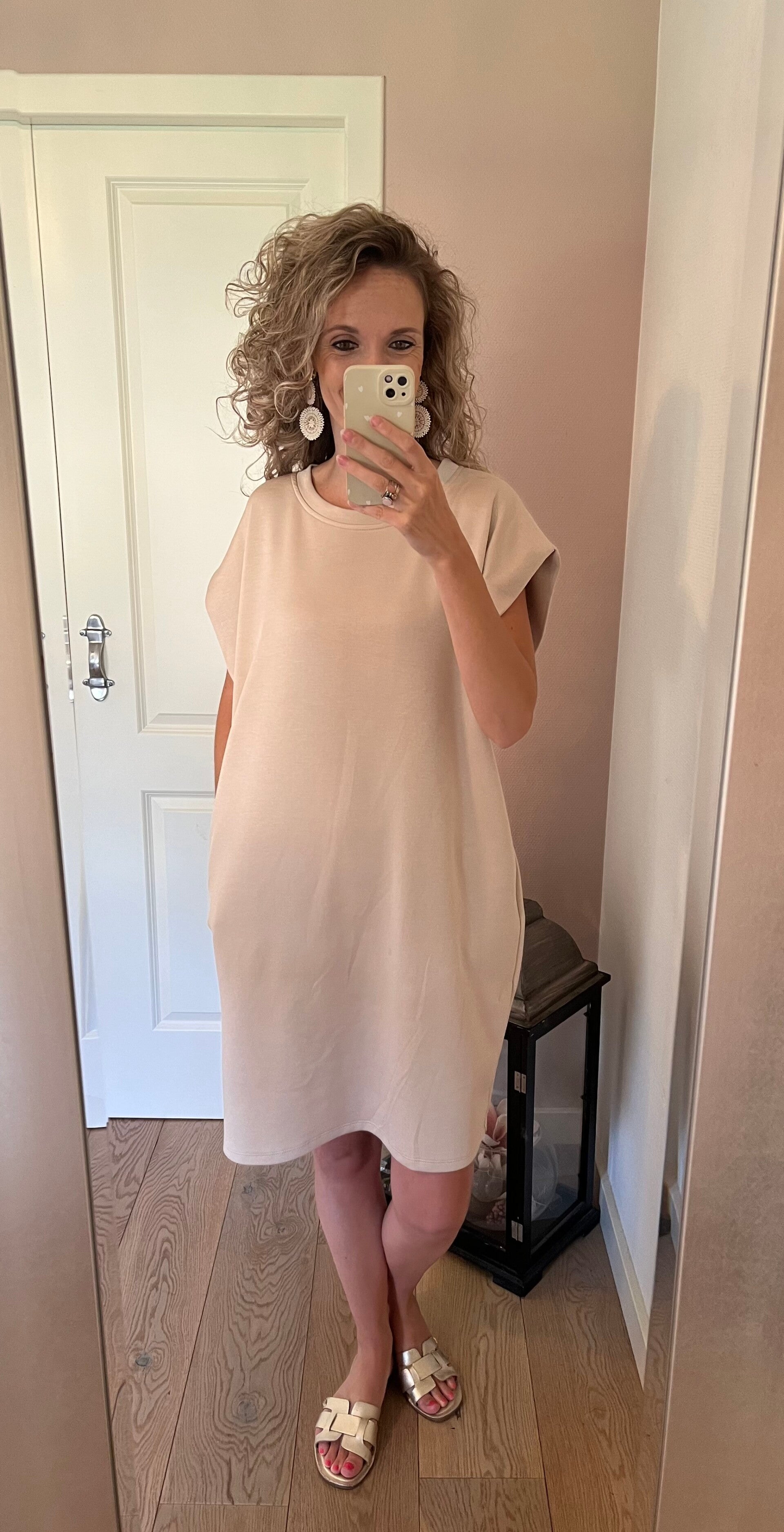 Heerlijk jurkje in de kleur zand. Twee zakken en een split aan één zijde. De jurk is one size en te dragen t/m mt 42