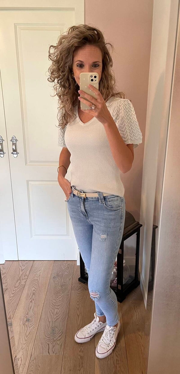 Deze stoere skinny jeans van het merk Hello Miss is een mid waist model met fijn veel stretch. De broek valt goed op maat. Ons model draagt haar eigen maat, maat S