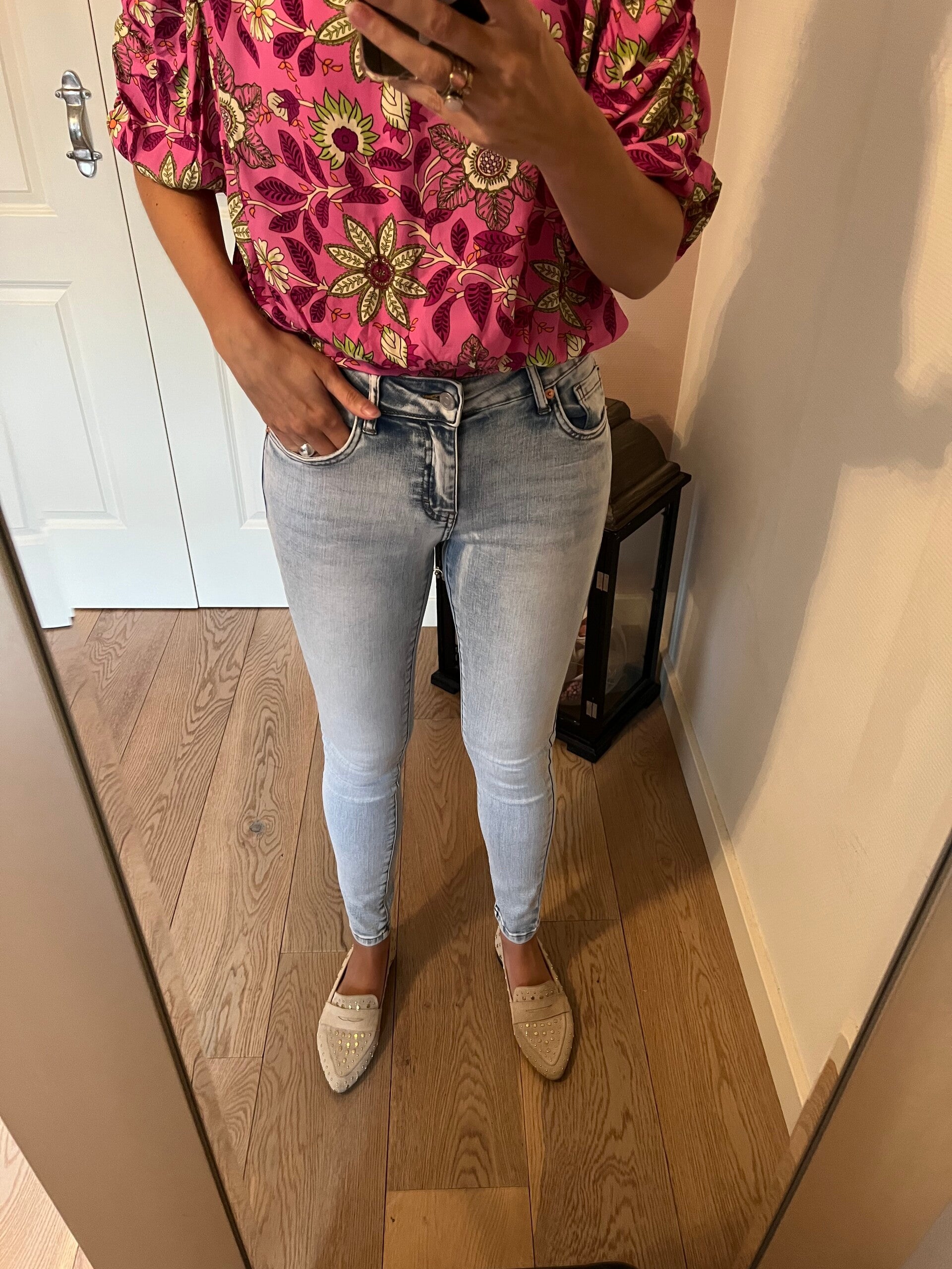 Deze mooie top/blouse is een iets korter model. Op een mid waist broek valt het bij ons model exact op de boord. Met een lage jeans dus ook leuk als Crop top te dragen en op een hoge jeans gewoon als top. Mooie print en heerlijk in dragen. Valt op maat.